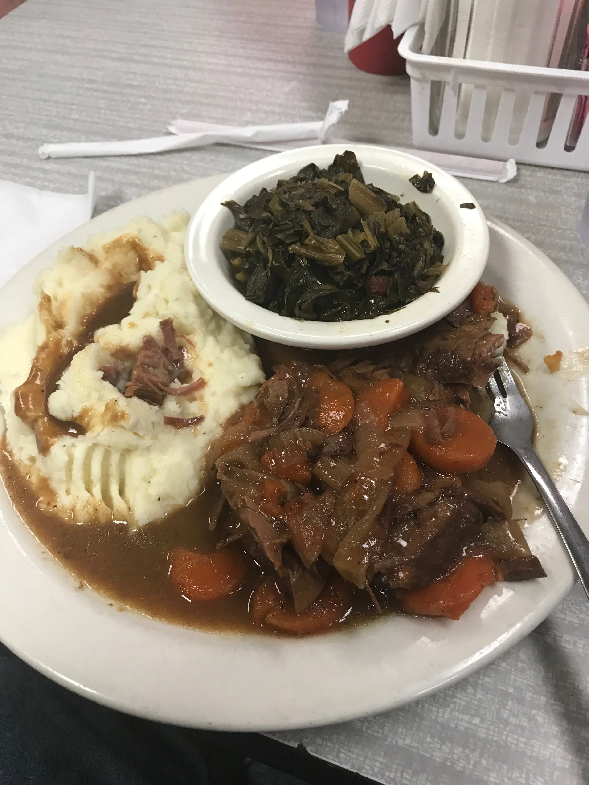It was amazing. We engaged in the noble Southern tradition of a Meat and Two meal, where you pick your meat and two sides. James and his mom got fried chicken with mashed potatoes and mac and cheese, and I got the day's special a pot roast with mashed potatoes and collard greens. Mr. Beaudet got the house chili. We were very satisfied. I don't know that I'd ever had real collard greens before, but I really liked them. They've got a very unusual flavor, but it complimented the pot roast (which was so tender and juicy) and the potatoes (just perfect) very well. Because we couldn't not do it, James, Mrs. Beaudet, and I also got milkshakes. I got a butterfinger milkshake which I'd never seen before but I thought worked very well as a mixed in candy. Needless to say we all left the place feeling pretty full.