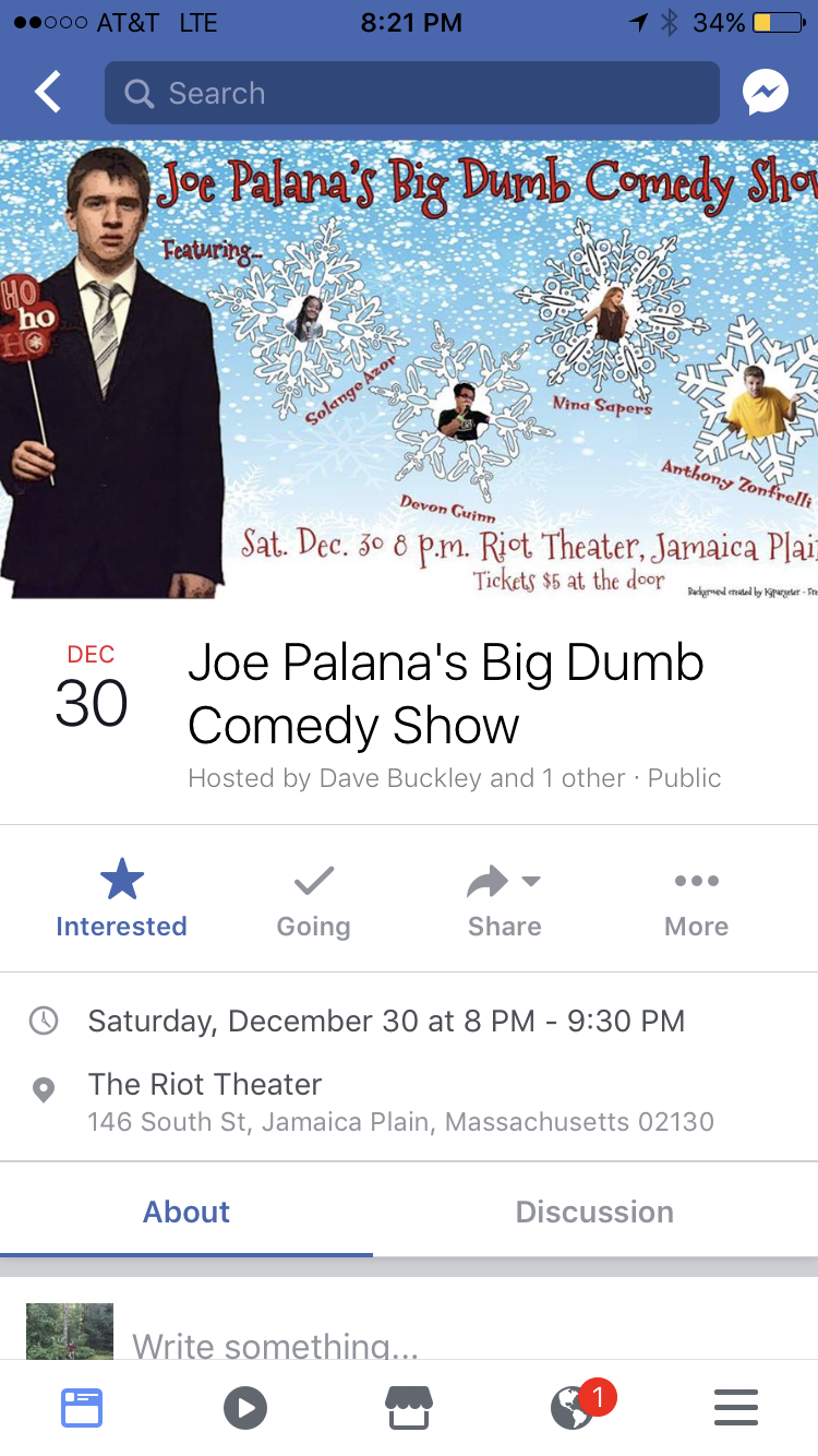 If you're reading this and in the Boston area on December 30th, my brother Dave has organized this really great show with a bunch of very funny comics I went to school with and me trying to a do a half hour of material.