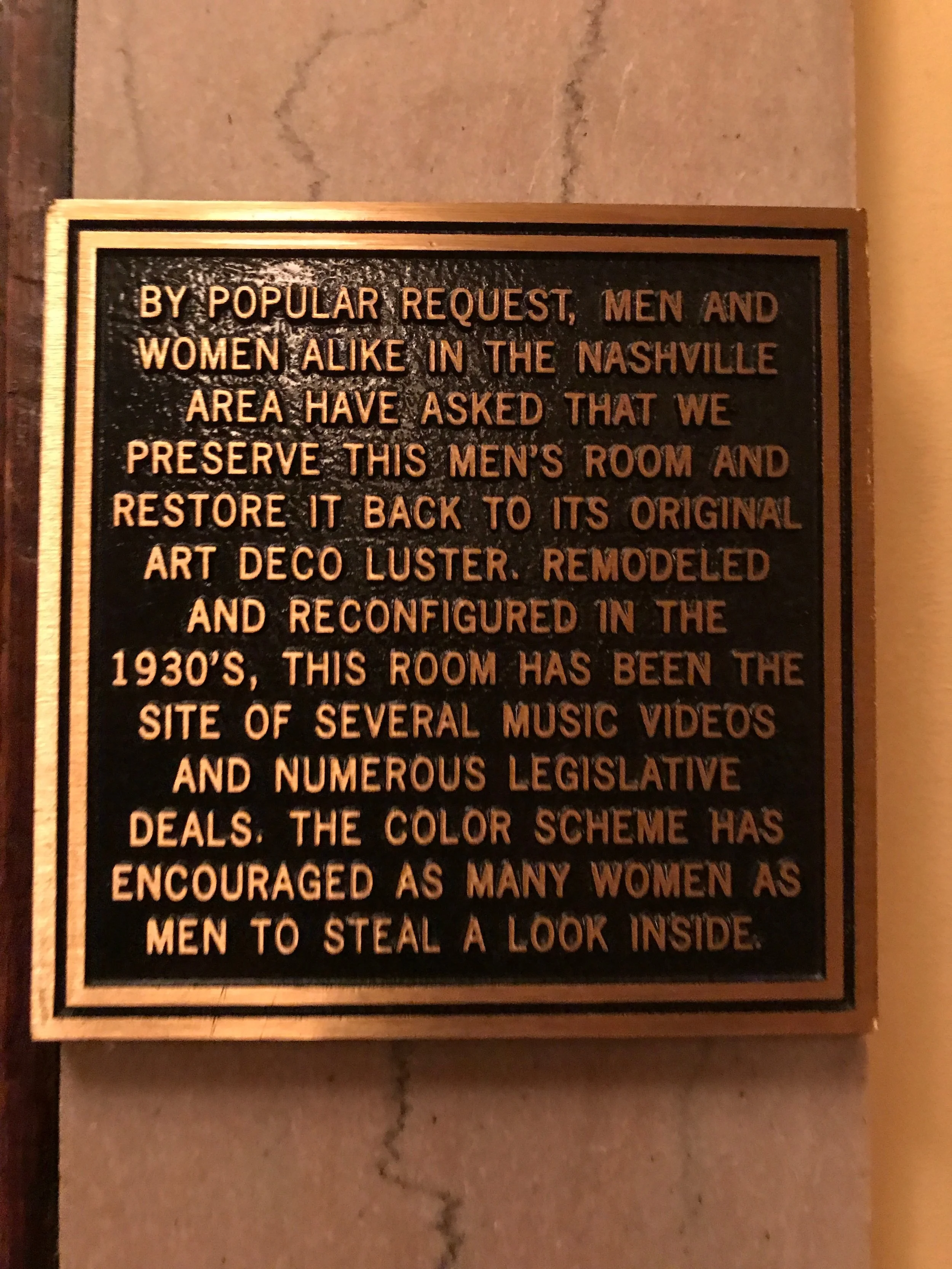 Properly caffeinated, I drove to see the Hermitage Hotel and their famous men's room. Their art deco inspired bathroom all in sleek green and black was apparently deemed so beautiful that both men and women were allowed in just to take it all in. I like the idea that maybe the best way to combat transphobic bathroom laws is to just make the bathrooms so pretty that everyone can use them. When the hotel tried to renovate it at some point in the 30s the people of Nashville banded together to preserve this unusual attraction. Apparently they've also won Restroom of the Year on numerous occasions, which is not an award I knew existed. I have to say that I was impressed but it is weird after all that that it is still a functional bathroom, so a bunch of old guys peeing does take away from the splendor of it all somewhat.