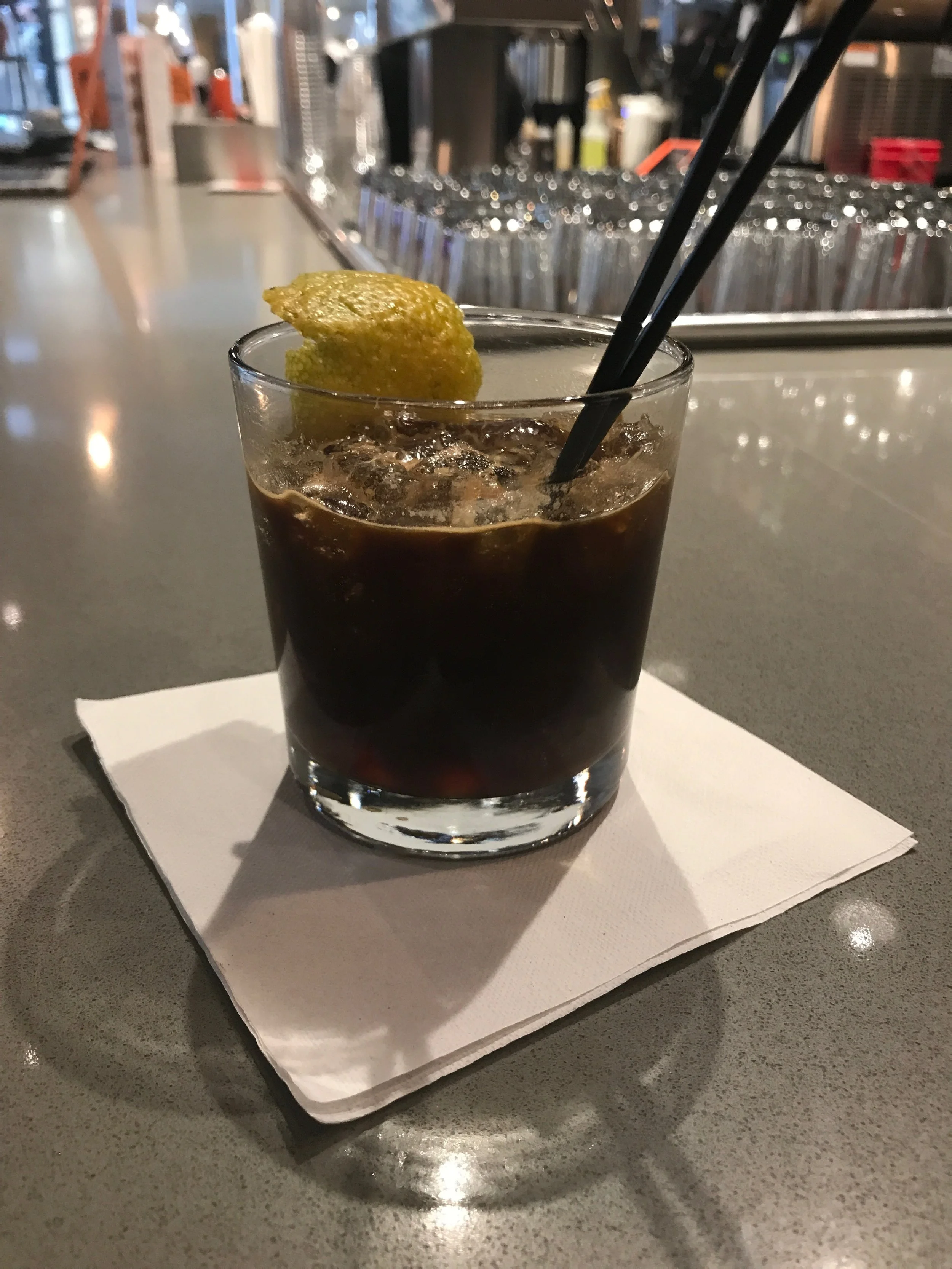 My first actual stop on the road was for coffee in Raleigh at a place called Sir Walter Coffee. I was immediately drawn to the place for the way the name really commits to being not quite a pun. I loved it, and it actually turned out to be a super hip and fairly hipstery cafe and bar with a really open and sleek aesthetic. Unfortunately they didn't have anyone getting you at the door by putting their coat over a puddle for you, which would have really taken their commitment to the name to the next level. They specialized in craft coffee "cocktails" so at my barista's suggestion I tried their Espresso Old Fashioned. It was made from a combination of Ethiopian Espresso, orange bitters, simple syrup, and an orange garnish. It tasted amazing, but I always find something slightly unsatisfying with the size of any espresso drinks. I know intellectually that it actually has roughly the same amount of caffeine as one of my normal iced coffees, but I feel like my brain needs a certain amount of time spent drinking something before it associates it with being substantial. I feel like I prefer beer over shots for the same reason. Maybe that's common, or maybe it's a me thing. It definitely did make me want to try more of their specialty concoctions so I guess if that's their real end goal then it was a roaring success.