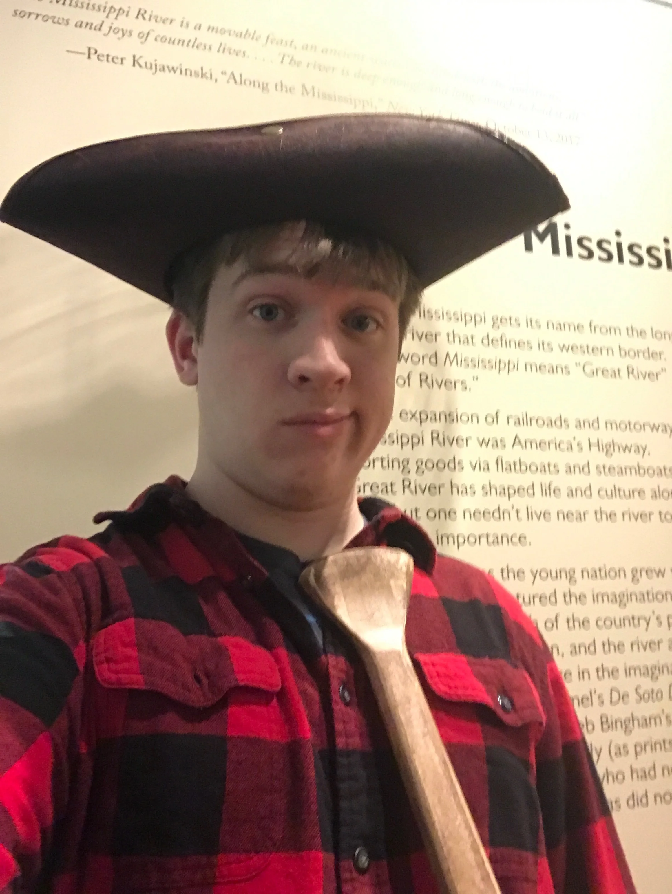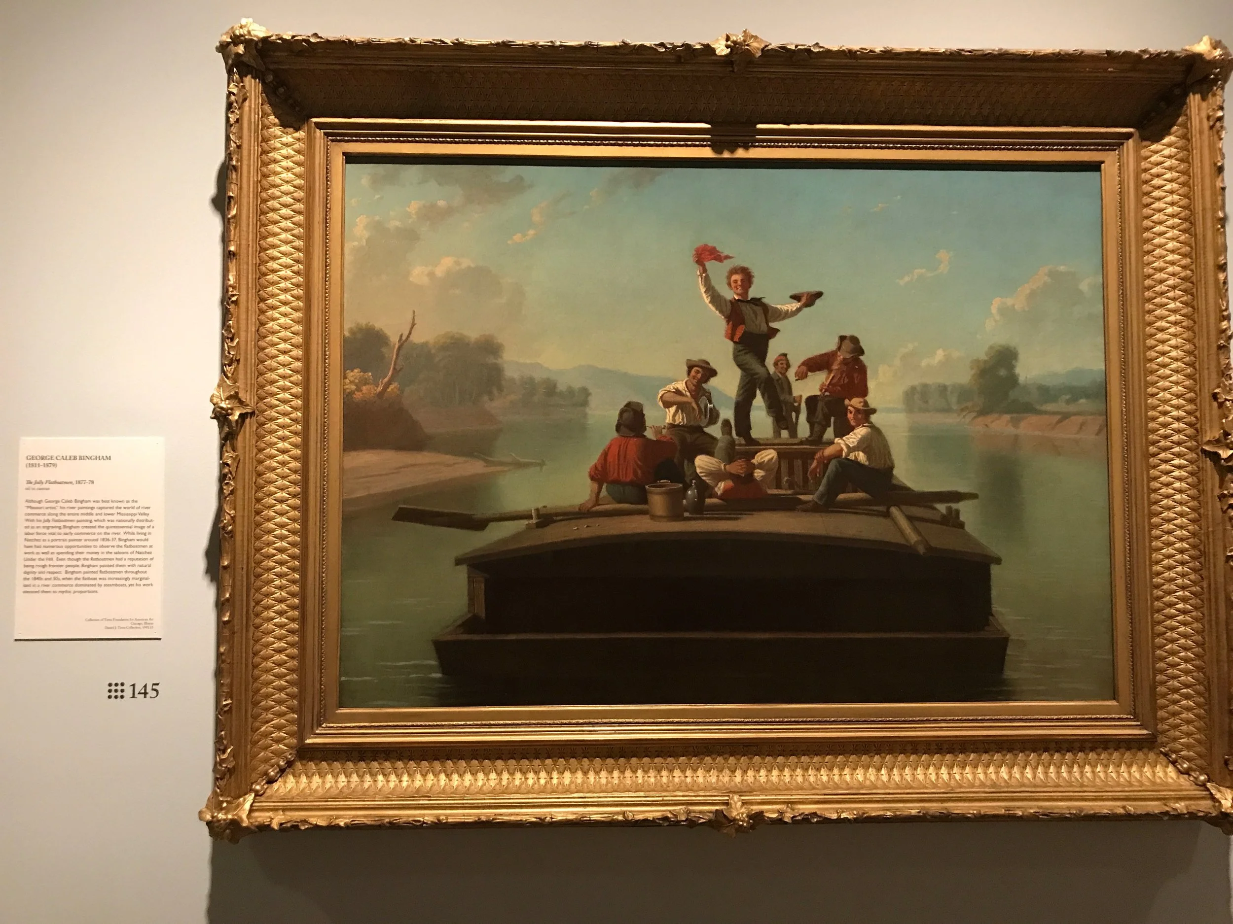 Next up came something a little more light hearted. It was a little interactive alcove featuring a painting called the Jolly Flatboatmen showing people having a grand old adventure on the ol' Muddy. Across from the paintings were props and costumes for you to recreate the painting with friends (and presumably children). I couldn't resist, and I might not be quite as jolly as the guys in the painting but I am very ready to go on a log raft and have adventures that serve as a metaphor for the entire American experience. Plus I think three cornered hats might be my look.
