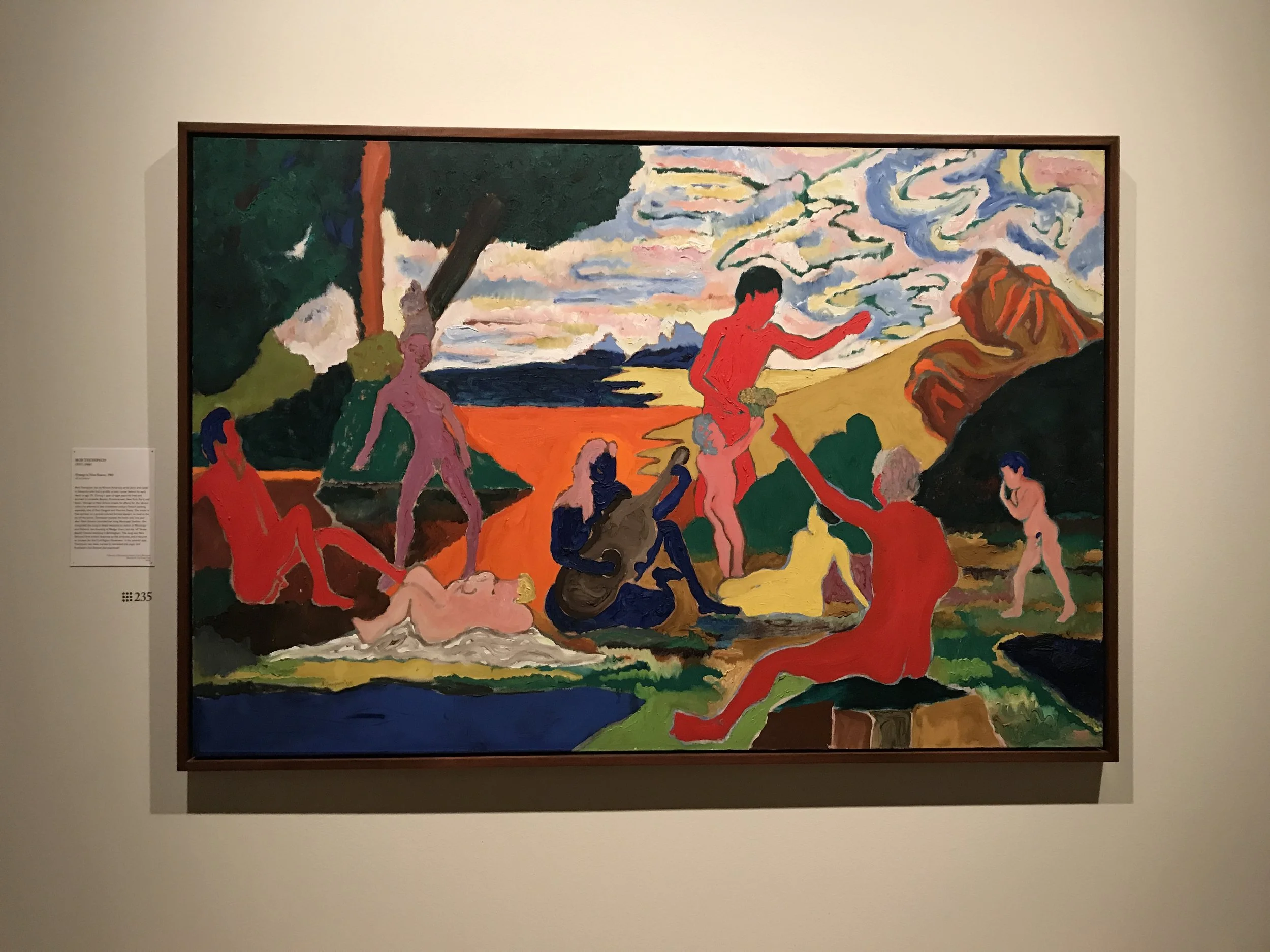 Almost hitting on a trend, the tougher theme of the flood was immediately followed up by more lighthearted works capturing different approaches to representing Southern landscapes, both manmade and au natural. I loved the variety of artistic techniques across the same theme. My personal highlights were: a contemporary piece by Randy Hayes which features a grid of photographs of different run down southern houses painted to form the image of a grand plantation mansion; a vibrant impressionistic piece by Bob Thompson called Homage to Nina Simone that captures more of the essence and universality of Ms. Simone and the lands she loved but hoped to change than a more straightforward representation might; a piece by an artist whose name I forgot to write down finding the beauty even in a back alley dice game; a piece by one of my favorites from the museum of art in Augusta, Georgia called Evening Meal by John McCrady which shows a cross section of a small one room cabin as a man naps in his chair after work while his wife makes dinner; a painting by Hale Woodruff called Mississippi Wilderness which shows a lone, Black girl walking through a jagged and harsh wilderness which couldn't possibly be a metaphor for any social things going on at the time; and a super surrealist painting called Road to Shubuta by Noah Saterstrom which uses a lovely mismatch of imagery and colors to capture a road trip through one of the most notorious lynching sites in Mississippi. I like that all these works together create a nice portrait of the mess of contradictions that arise in any place with enough history, a mix of the grand and mundane, the wonderful and the horrible, and the beautiful and ugly that are a part of the state and the nation's natural and social landscape.