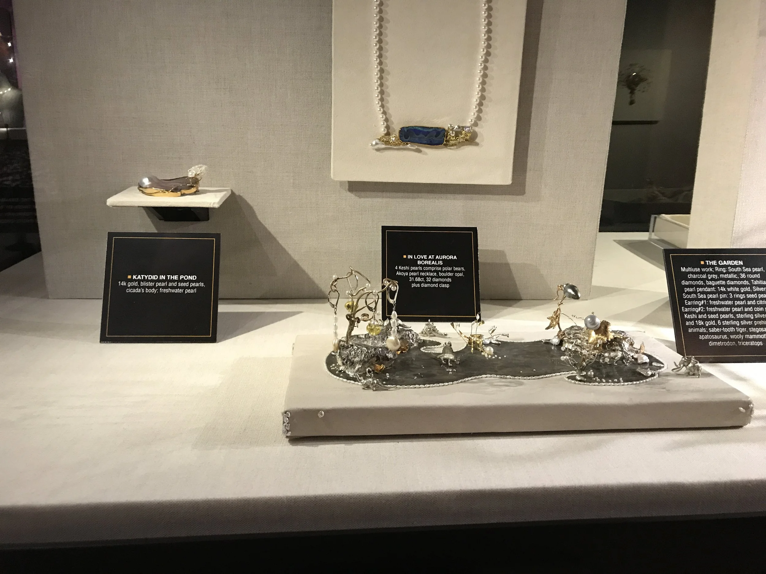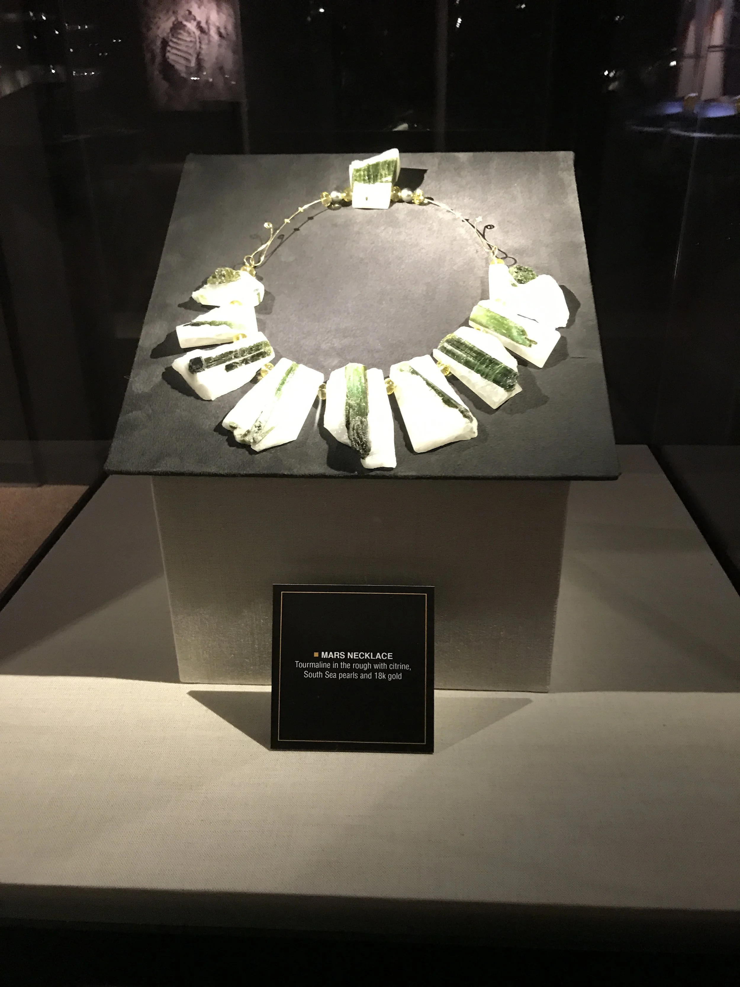 My personal favorite exhibit, even moreso than all the fantastic technology, was a gallery of fine jewelry by an artist named Kathy Chan. I think it stood out to me, because it was so unexpected relative to everything else there. Born in China and completely self-taught in her art, Chan works with precious gems, metals, and minerals to create truly astonishing pieces of art. Most of the works were space themed, including a white gold Milky Way necklace, some necklaces with meteorite gems, and my favorite, a necklace with gems representing each planet placed apart at the correct spacing. There were also some non-space themed pieces including a golden praying mantis and a silver and pearl pond with little metal frogs and diamond water drops. There was also a necklace with a kind of crystal called tourmaline, that I'd never hear of before but my geology studying friends say it's pretty cool and rare. I think there's just some basic center in everyone's brain that lights up when it sees shiny things, and this gallery set it on fire.