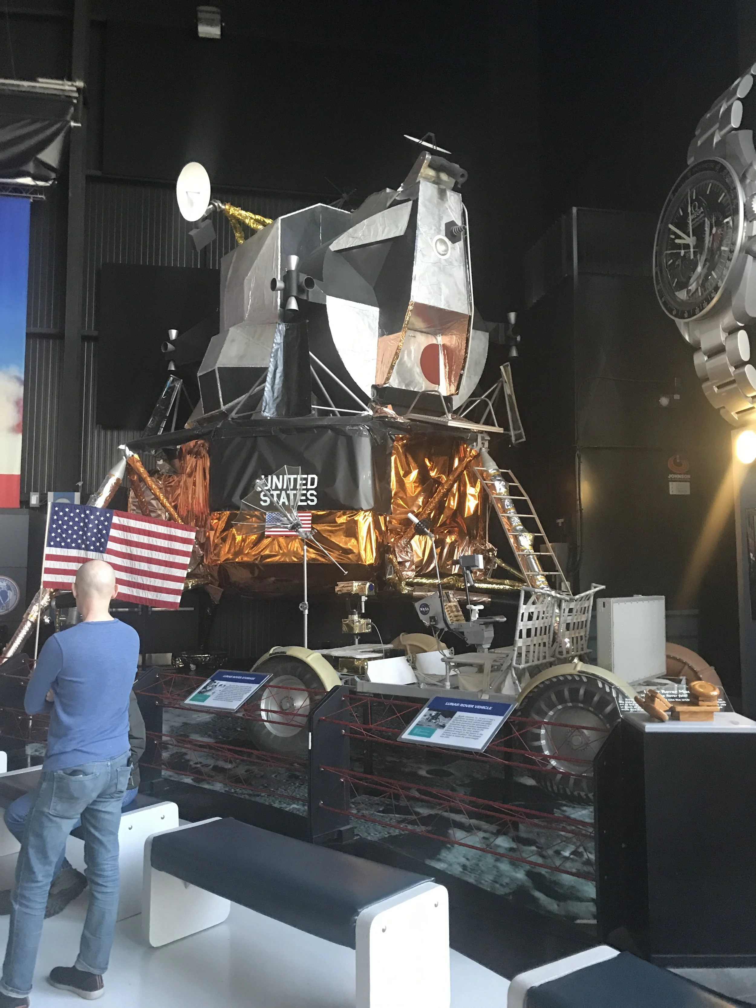 After regaining my sense of balance, I went to the next building called the Saturn V hall. Fittingly enough inside the building was the Saturn V which took the first men to the moon. The hulking machine was hanging from the ceiling in sections all along the massive hall. On the ground were various little stops explaining the history of the rocket as well as some of NASAs other advancements. The thing that most impressed me was the fact that the rocket was programmed using IBM punch cards. It's absolutely insane to me that man got to the moon using cardboard. The hall also had the actual Apollo 16 Lunar Capsule, an authentic Lunar rock that astronaut Alan Bean said was his favorite, and a scale model orbital space lab.