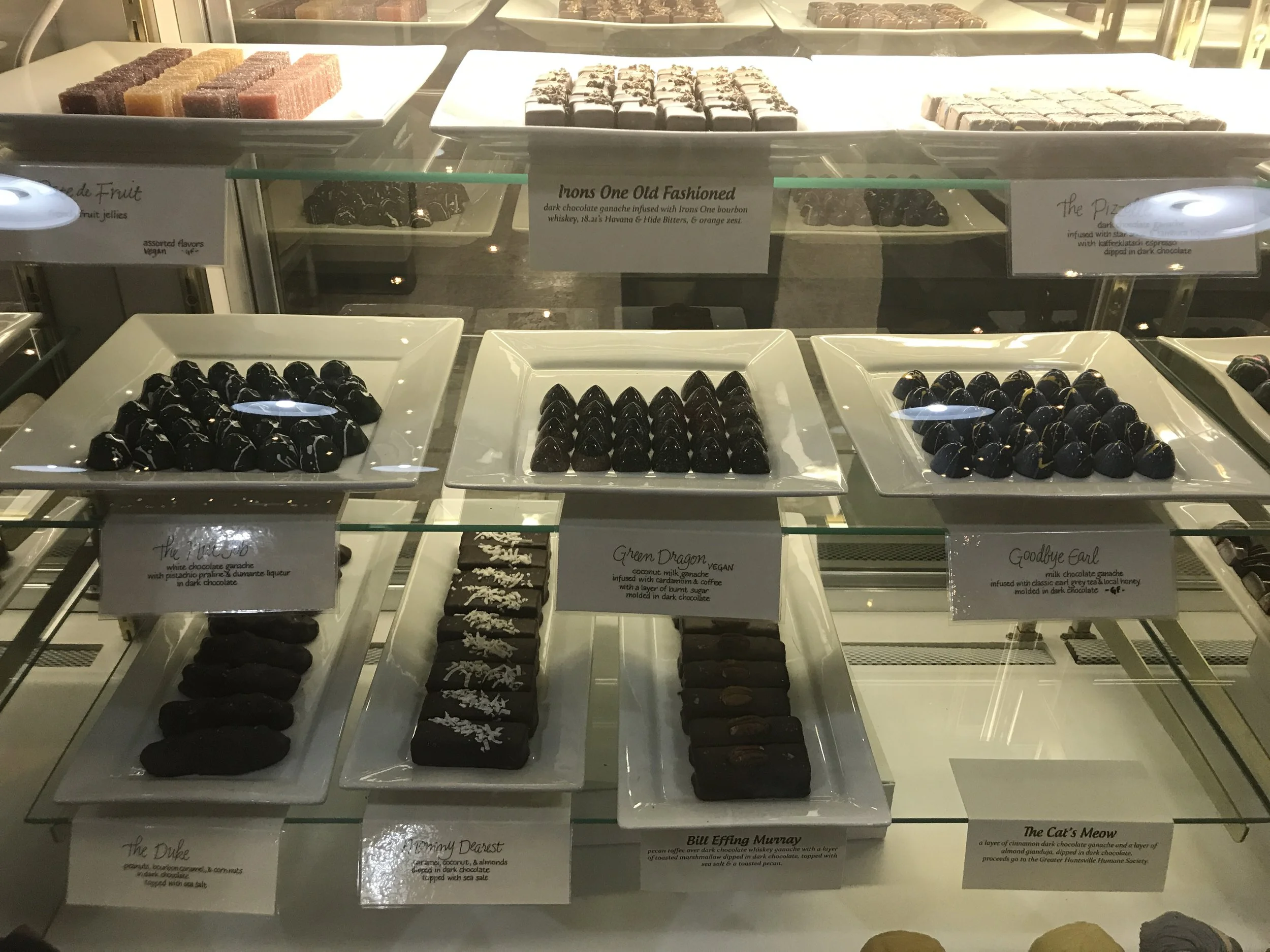 Before leaving the art center, I stopped at a place called Pizelle's Confection. I think it is entirely possible that regardless of how anything tastes, they probably have the prettiest cakes and chocolates I have ever seen. Because of how beautiful everything looked, and also largely because they had a chocolate called Bill 'Effing Murray, I did feel obligated to see if everything tasted as good as it looked. They had a wide variety with some pretty unusual flavors, but because everything was handcrafted it was relatively expensive for the size of the truffles so I limited myself to 1 truffle and 2 bars that I paced apart reasonably so as to not spoil my appetite for dinner. I tried the truffle first which had milk chocolate ganache, Earl grey tea, and local honey covered in a dark chocolate shell. It was called Goodbye Earl, and it tasted as good as I imagine the revenge from the titular Dixie Chix song felt. I'd recommend checking out their website just to see how cool these things look up close and to read their funny names.