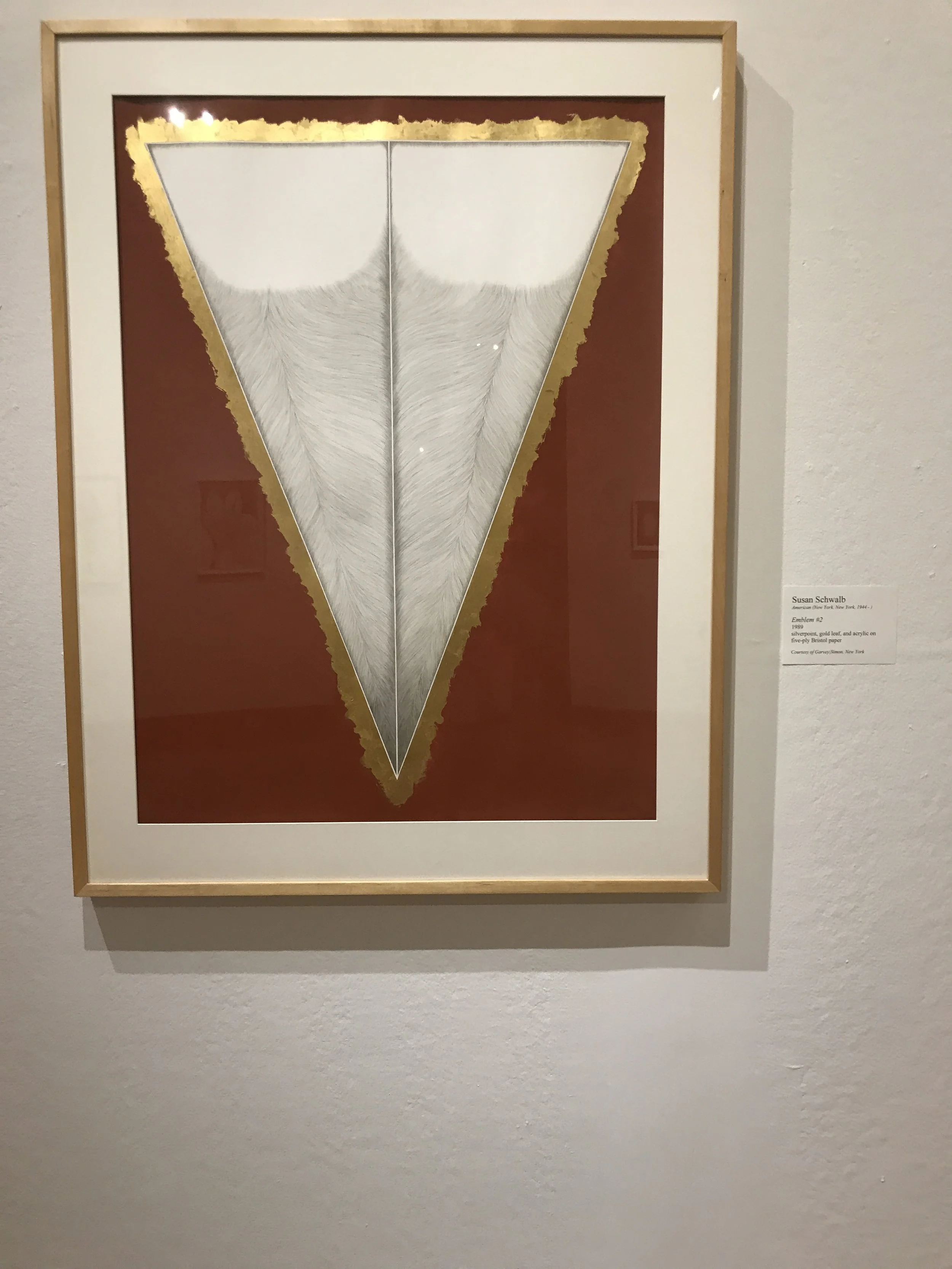 My favorites were then, unsurprisingly, Schwalb's earlier representational studies of different flowers. The detailed works are almost photo-realistic minus the soft metallic luster and they look really pretty. To me they show how much objective talent Schwalb had as a draftsman, and that she could have basically done anything she wanted with her medium but the abstraction just called to her artistic impulses. The one abstract piece I really liked was the one on the lower right below, because it used a different combinations of metals and papers to create a really interesting and oddly dynamic textured image.