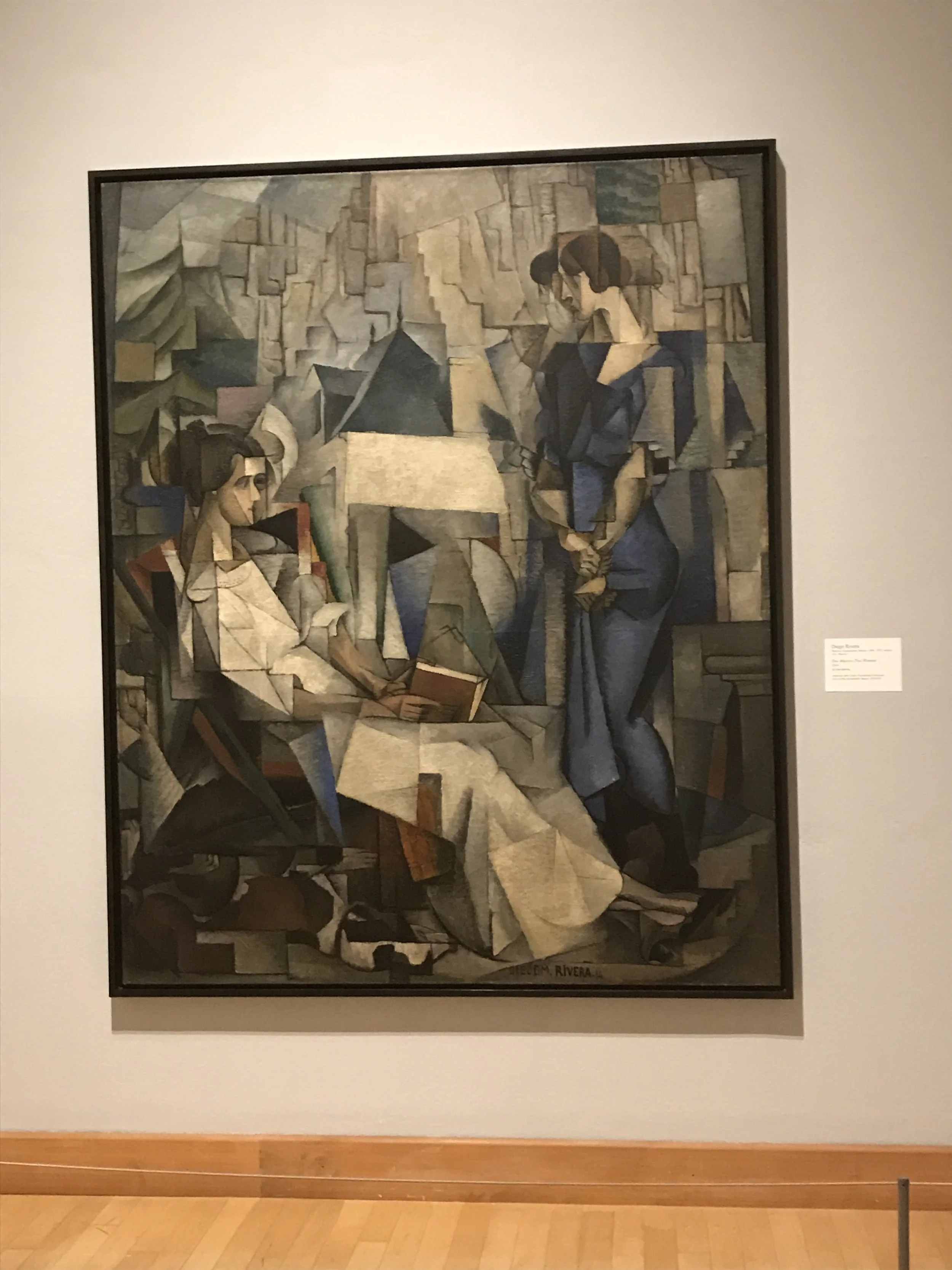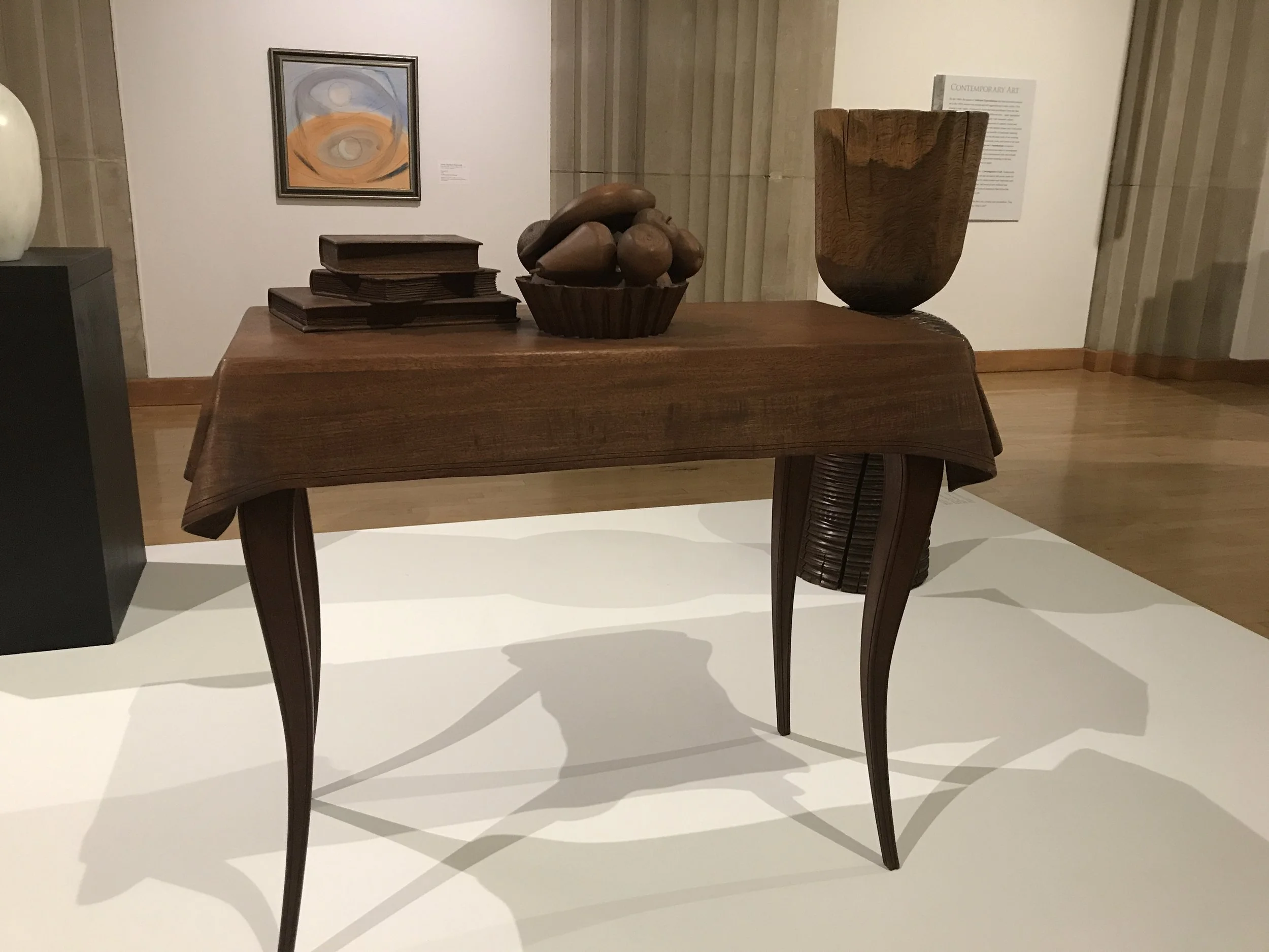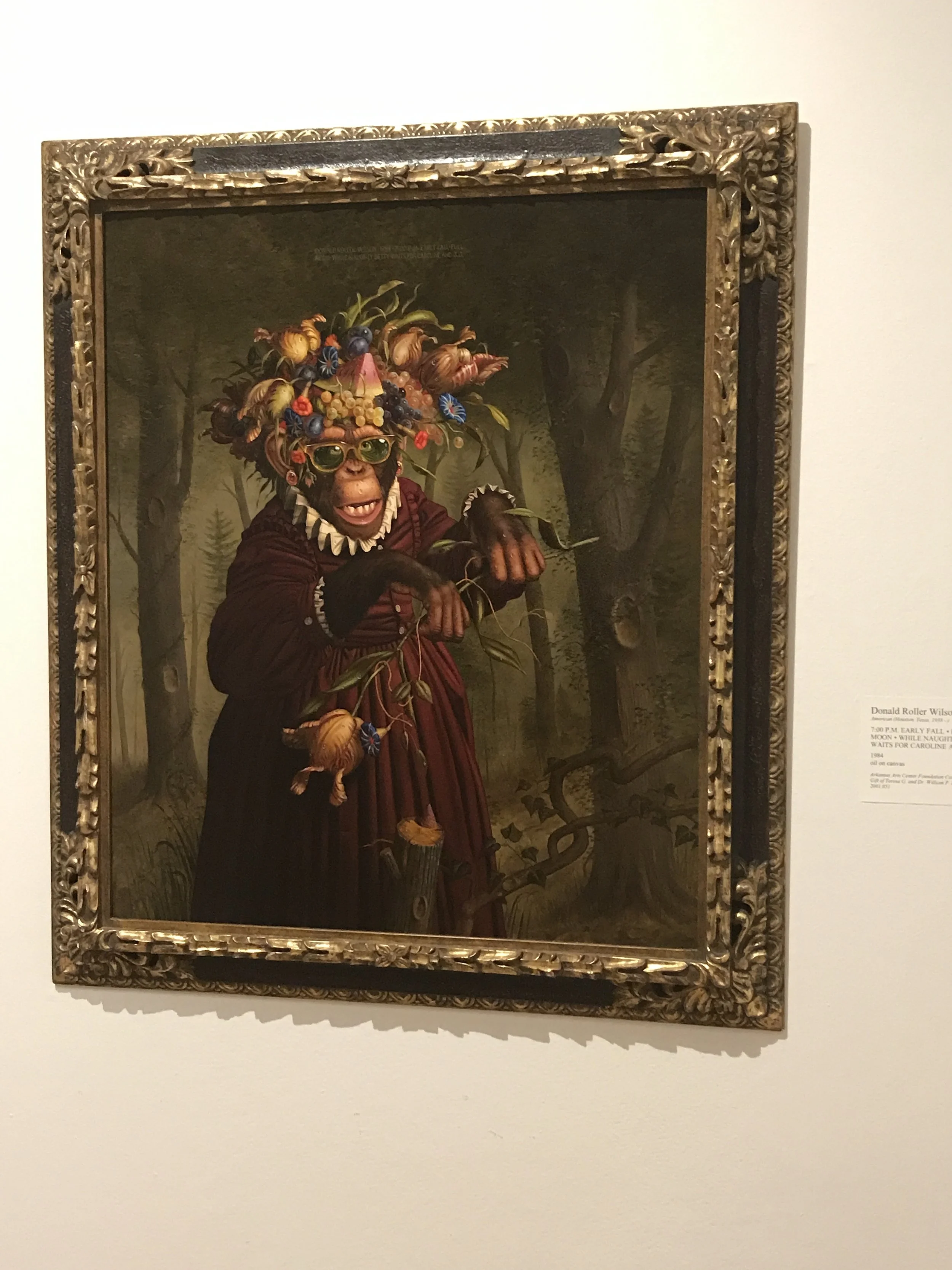 My favorites from this wing included: a massive installation by Japanese-American artist, Wendy Maruyama, featuring hundred of replicated tags from all the people who were forced into Japanese Internment camps in the US; a classically haunting painting by Andrew Wyeth of a mysterious woman fleeing an ominous farm; an oddly dreamlike painting of women freaking out in a field about the moon called Moonstruck Girl by Carroll Cloar; Some woodblock optical illusions by an artist named John Digby; a wild painting of a wildly dressed up chimp wildly named 7:00 P.M. EARLY FALL *FULL MOON* WHILE NAUGHTY BETTY WAITS.. by Donald Roller Wilson; a wonderfully winding farm scene by Thomas Hart Benton; a very industrial mural study by Hildreth Meière entitled Labors of the Hand; a powerhouse cubist portrait of two women by Diego Rivera; and an amazing wooden sculpture called Table with Fruit and Books by Wendell Castle that is actually all one connected piece even though it looks like smaller pieces stacked on a table.