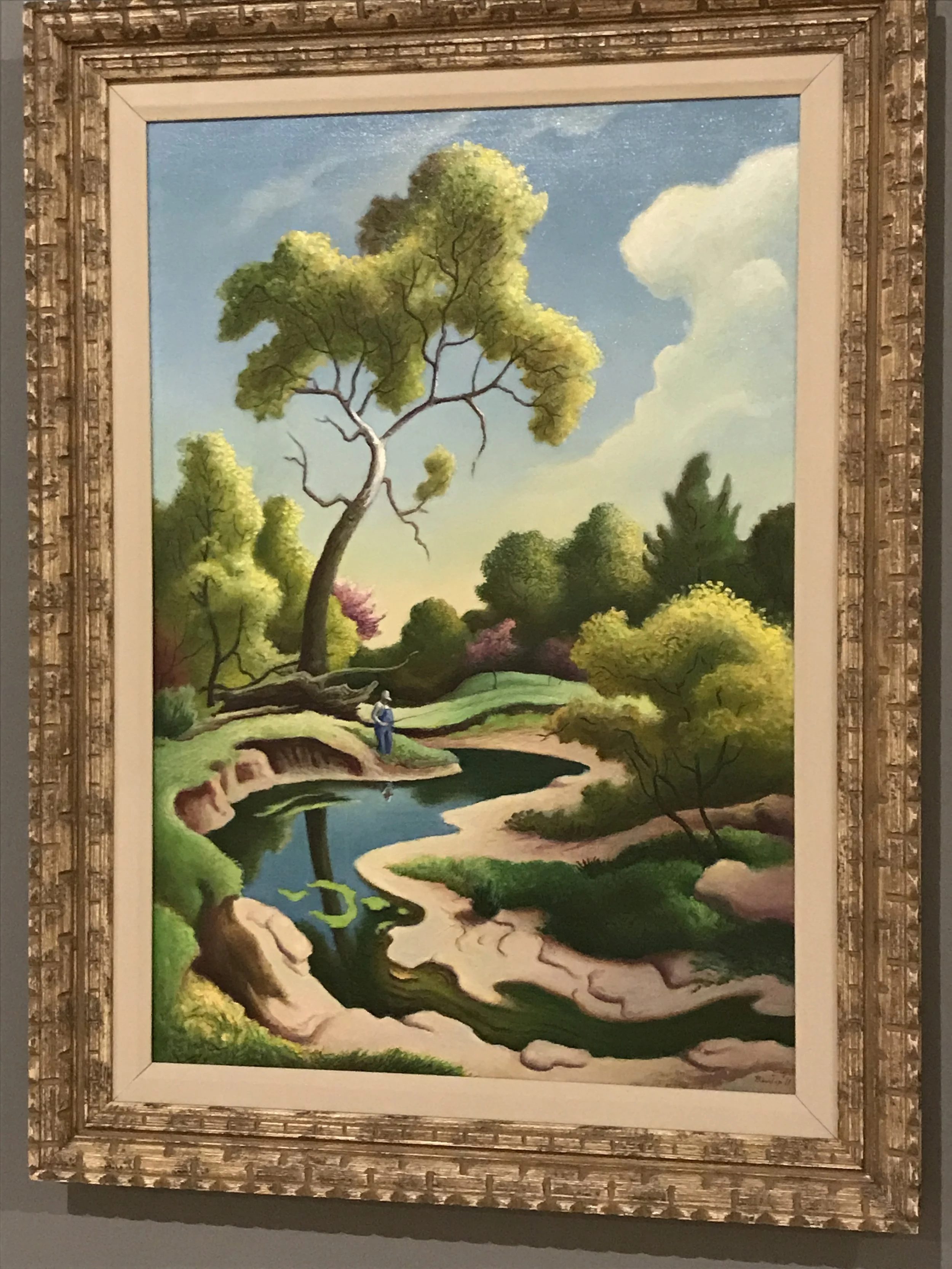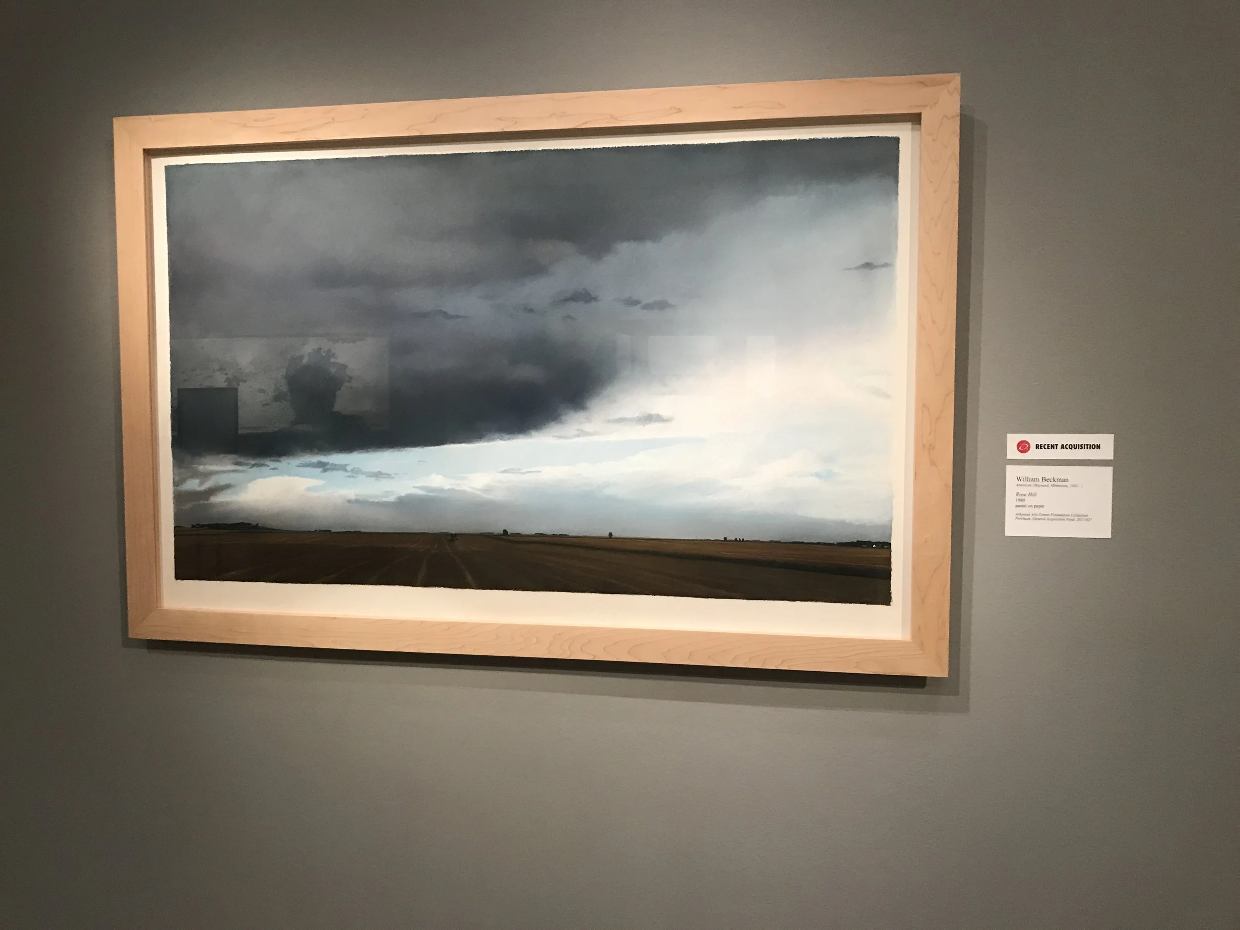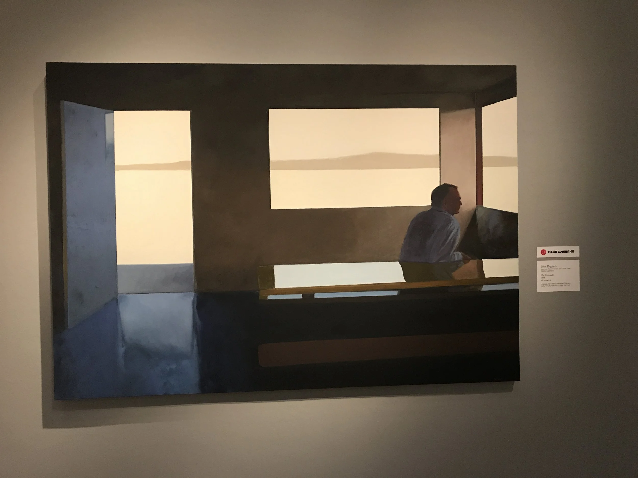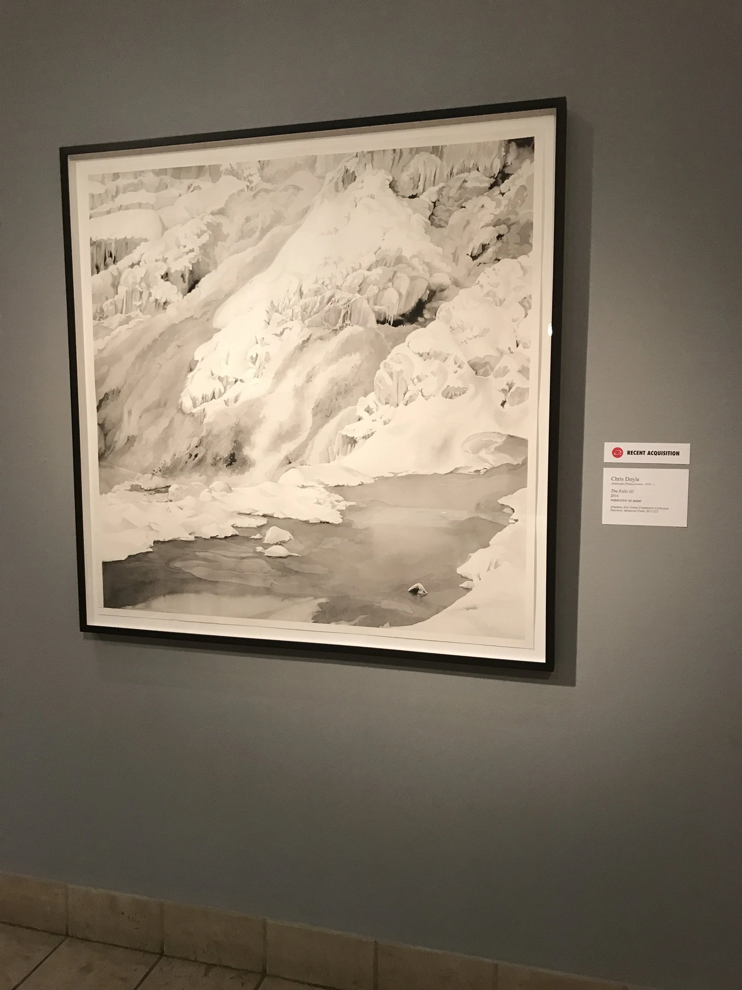 Back in the main lobby, they had some pretty impressive new acquisitions including an ominous landscape painting by William Beckman; a shockingly photo-realistic black and white watercolor of waterfalls by Chris Doyle; a Hopper-esque painting of a man alone in a hotel lobby by John Register called the Colorado; and a trippy abstract painting by an artist named Val Briton.