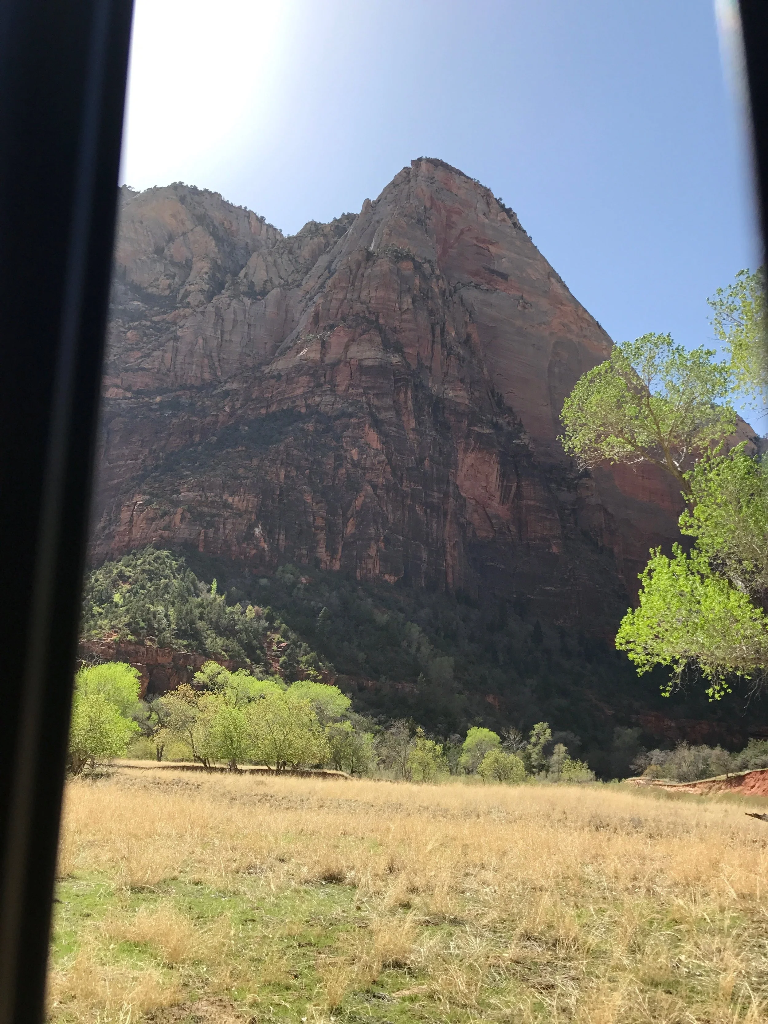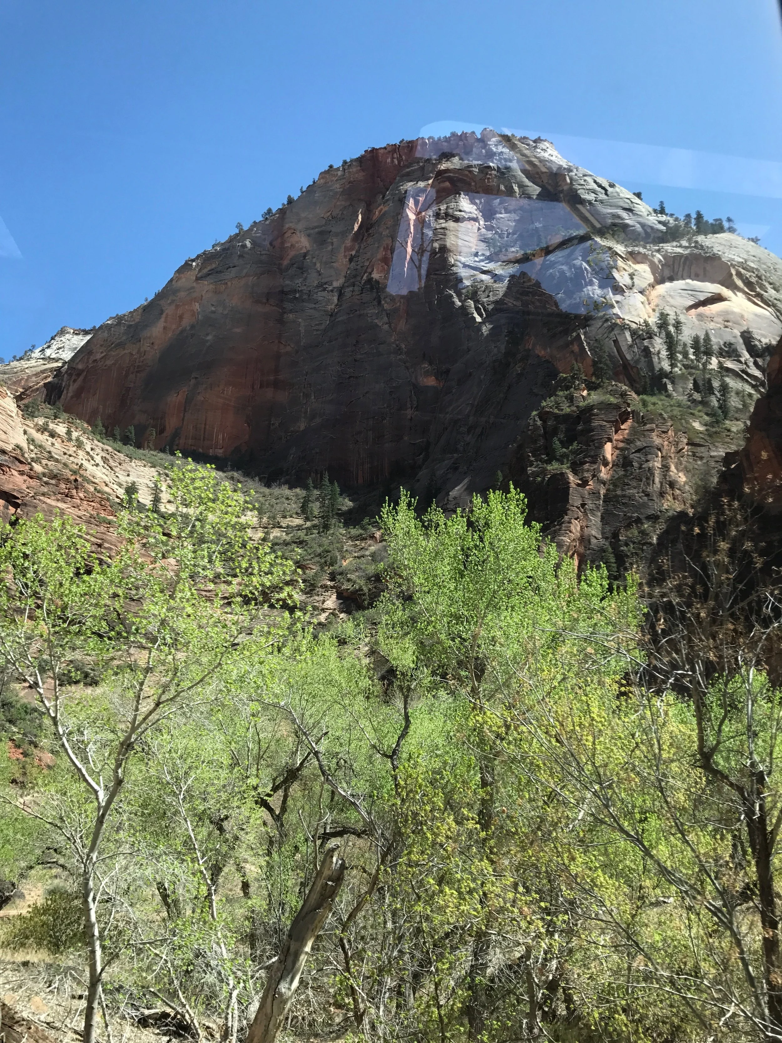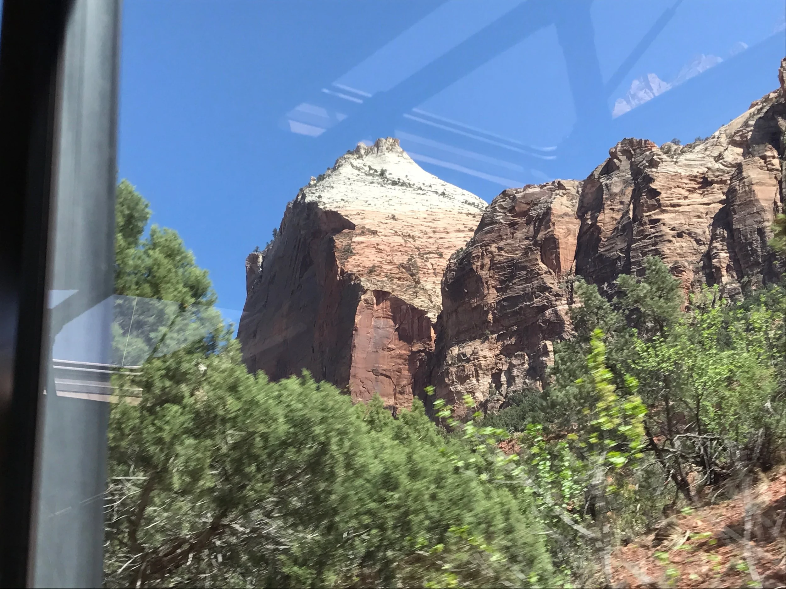 Normally on long bus rides, I tend to fall asleep but the views in Zion were so varied and stunning I couldn’t take my eyes off of them. You really get your bang for your nature buck here, because the gigantic park contains just about every geologic formation you can think of including but not limited to: mountains, canyons, buttes, mesas, monoliths, rivers, slot canyons, and natural arches. The park is also located perfectly at the junction of the Colorado Plateau, the Great Basin, and the Mojave Desert so it contains a huge variety of scenes and colors ranging from green green woodlands and wetlands to red rocky deserts all just sort of jumbled together. The enormity of the park also doesn’t just sprawl outward but also vertically with the lowest canyon being 3,666 ft deep and the highest mountain peak reaching 8,726 ft high (just about a 2 mile difference in elevation!). It was really kaleidoscopic effect driving through all of that.