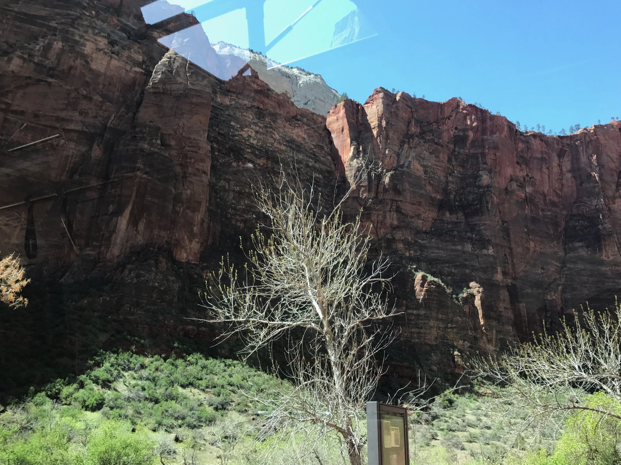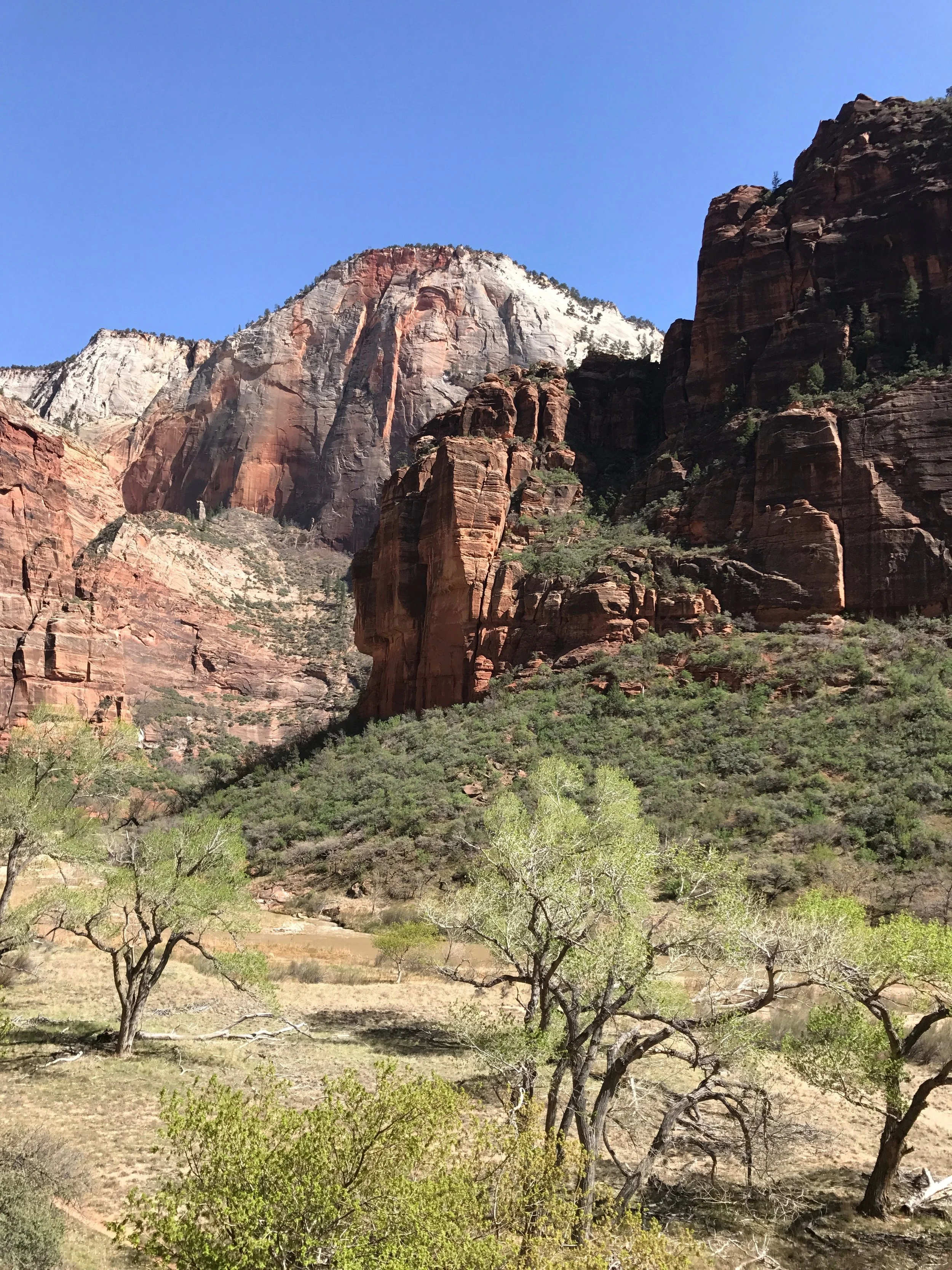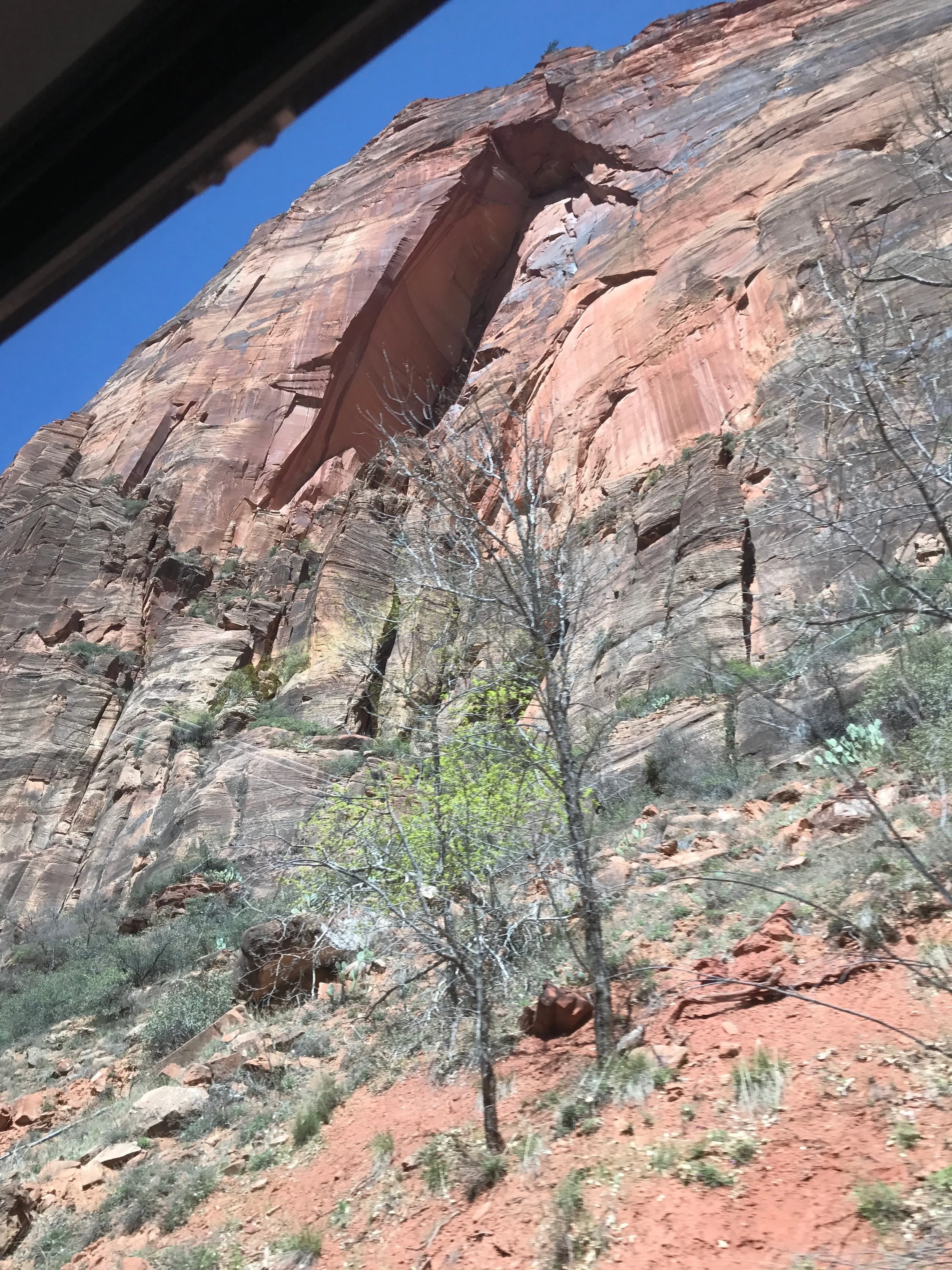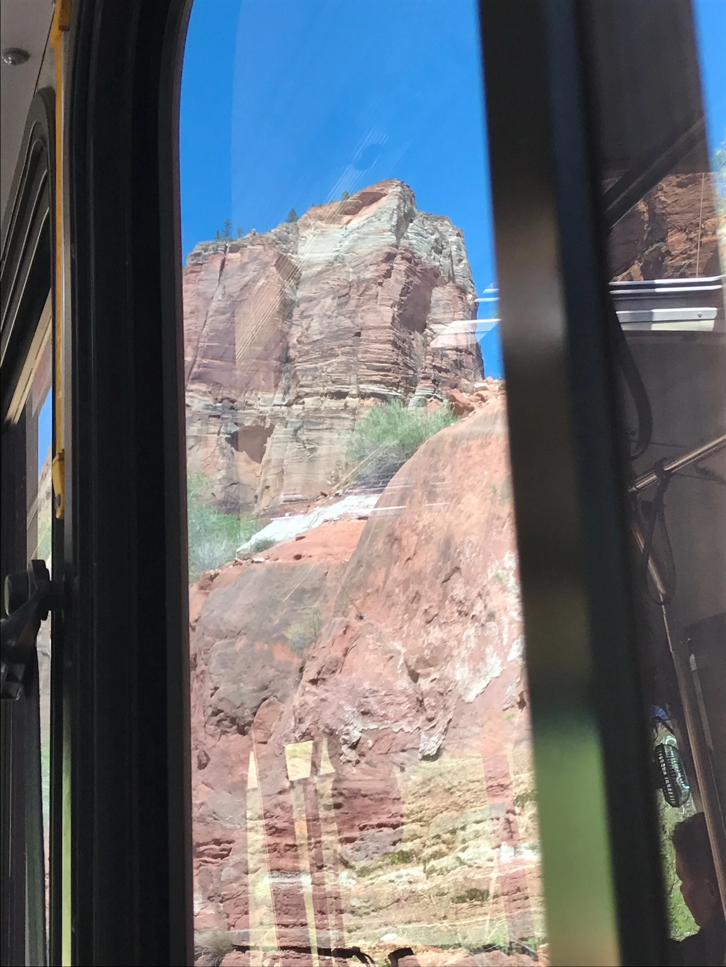 Normally on long bus rides, I tend to fall asleep but the views in Zion were so varied and stunning I couldn’t take my eyes off of them. You really get your bang for your nature buck here, because the gigantic park contains just about every geologic formation you can think of including but not limited to: mountains, canyons, buttes, mesas, monoliths, rivers, slot canyons, and natural arches. The park is also located perfectly at the junction of the Colorado Plateau, the Great Basin, and the Mojave Desert so it contains a huge variety of scenes and colors ranging from green green woodlands and wetlands to red rocky deserts all just sort of jumbled together. The enormity of the park also doesn’t just sprawl outward but also vertically with the lowest canyon being 3,666 ft deep and the highest mountain peak reaching 8,726 ft high (just about a 2 mile difference in elevation!). It was really kaleidoscopic effect driving through all of that.