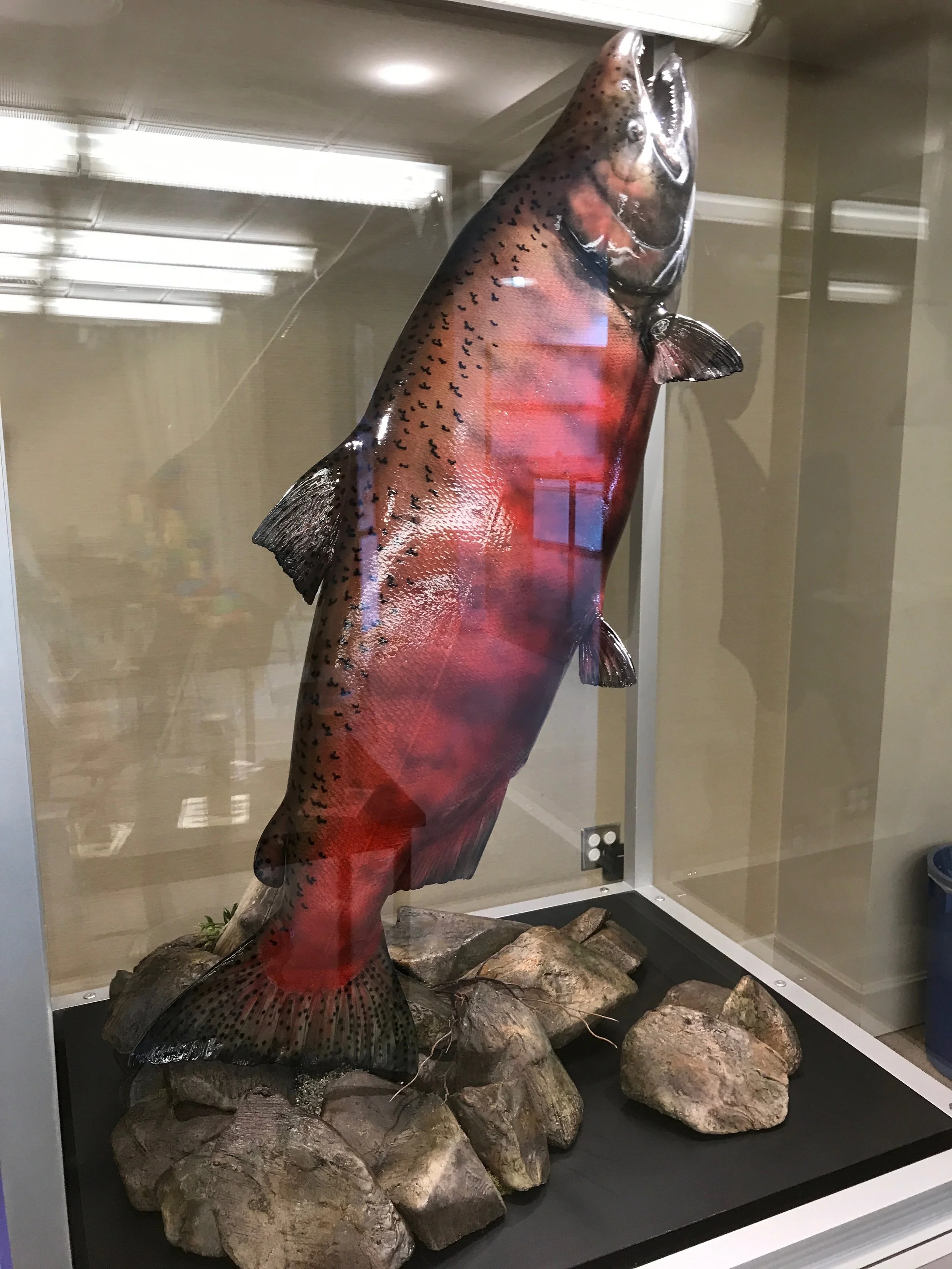 After enjoying the park, I made my way to the Northwest Museum of Arts and Culture, which as the name implied had a little bit of everything including art, historical items, and cultural artifacts from the local Northwestern tribes. The first exhibit I checked out was about the native wildlife, specifically the mighty sockeye salmon. There were some salmon fun facts in the exhibit, but was mostly drawn to the artwork including some impressively lifelike sculptures, and gorgeously psychedelic mosaic artwork by local artist/naturalist Melissa Cole.