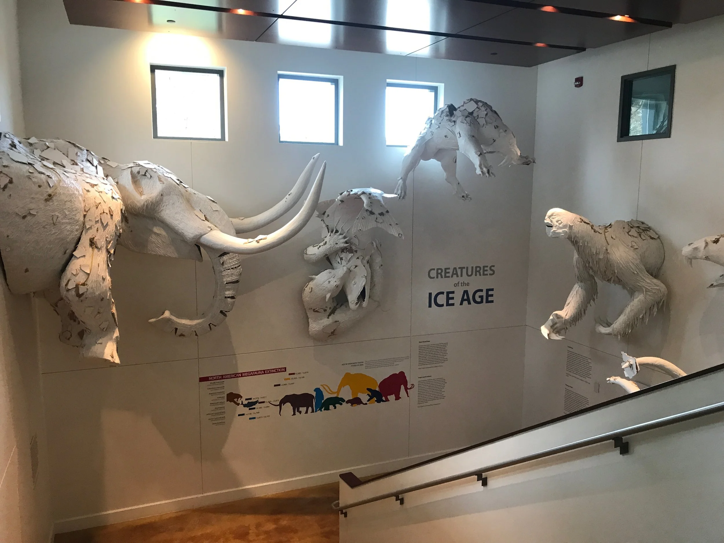 The staircases continued to be a surprise delight with the next one I went down containing a display that was equal part whimsical, artistically impressive, and really informative about the prehistoric wildlife in the region. Local artist Peter Thomas used exclusively recycled materials such as cardboard, paper, and discarded steel to create models of ancient critters that literally pop out of the walls. The creatures are heavily researched and incredibly lifelike, but his decision to keep them all the same off-white as the wall lends them a playfully abstract quality as well. The display is meant to inspire awe and imagination in visitors and prompt them to learn more about the animals and the ice age with some cool facts and timelines along the walls. The thing I was most shocked to learn is that at one point the region was home to Saber Tooth Salmon (!) which seems like it has to be a joke from the Flintstones but is in fact totally true. I loved the concept and execution of this little stairwell so much and I was super impressed that the artist was able to give all the animals their own hints of personality, especially the little baby mammoth dangling his legs and looking like maybe he knows he shouldn’t have wandered off.