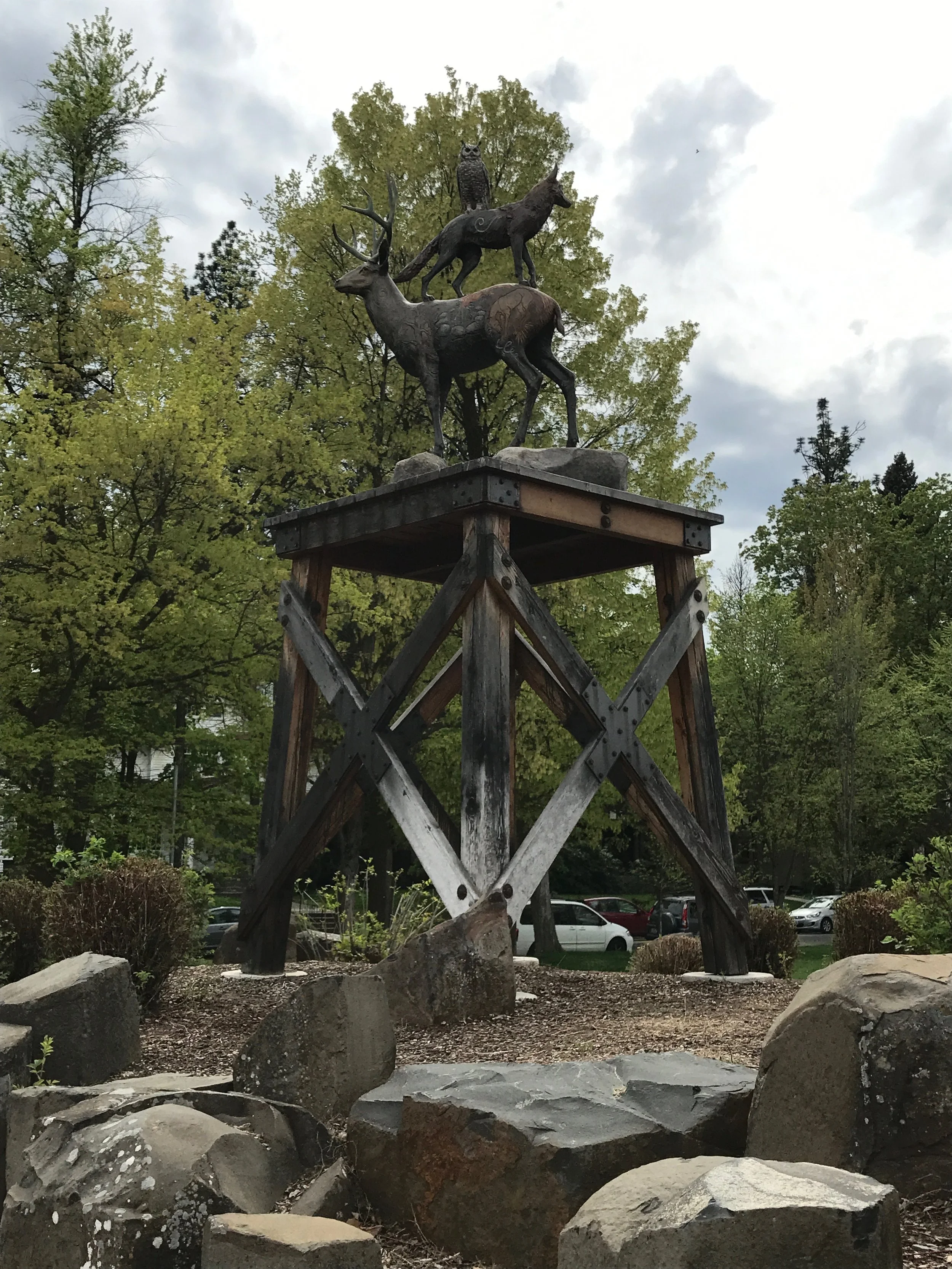 As I was leaving the museum, I had to stop to appreciate an over 12 ft. tall sculpture in the parking lot called the Navigators by Brad Rude, which features a deer, a coyote, and an owl all stacked on top of one another on a large wooden platform. I really love the attention to detail of making such lifelike fully realized animals with the whimsy of having them do something that animals absolutely never do in the real world.