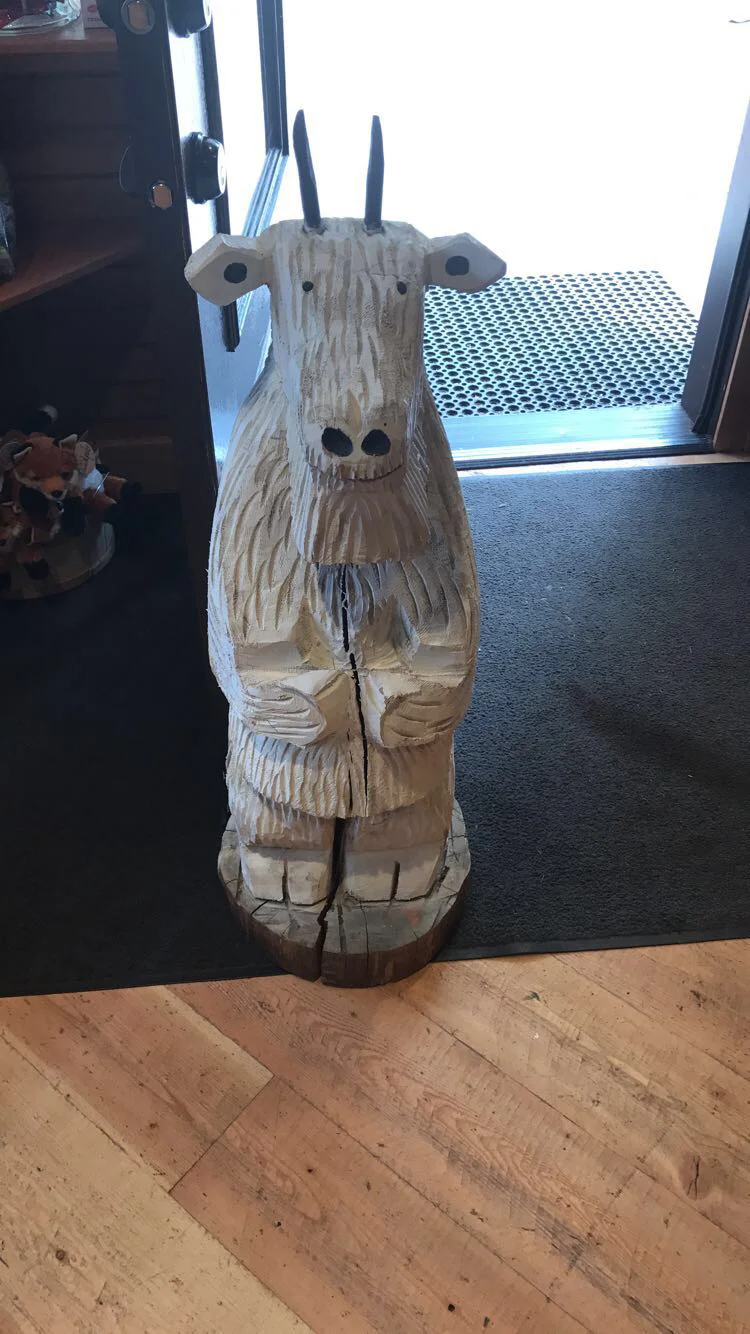 After staring out over the pristine waters for a few serene minutes, I started circling back to the visitor’s center. I stopped at a cute tourist center called Eddie’s Cafe and Gifts. They had some good coffee which was very welcome, but I was even more happier to see all the neat handmade crafts on display. My favorite thing in the store was the goofy grinning wood-carved mountain goat who greeted visitors at the door. I was also very impressed by some of the local ceramic mugs, plates, and candles with different park themed animal and nature silhouettes. I like that you never know where you’re gonna stumble upon cool art.