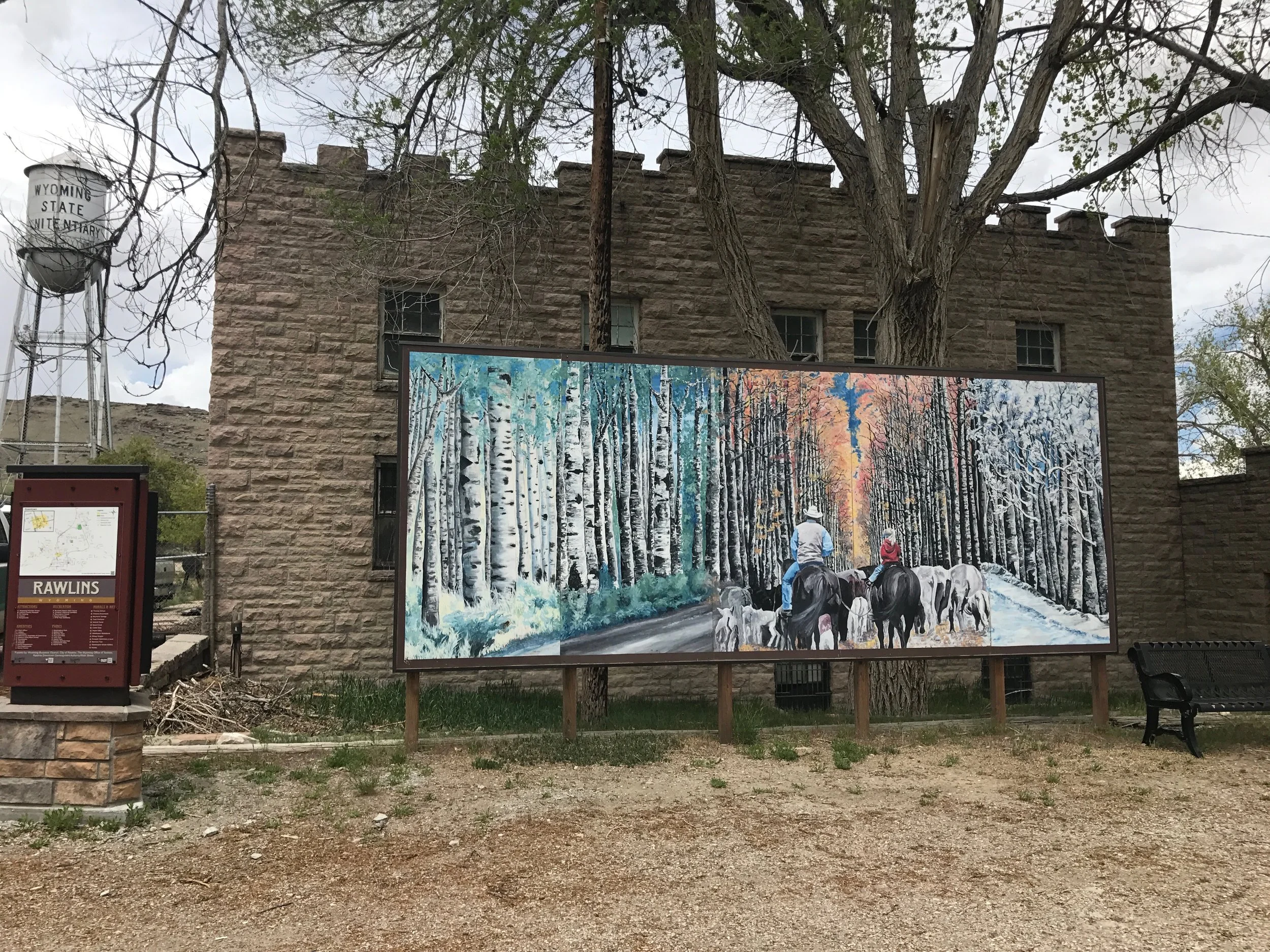 A big reason I stopped by Rawlins, besides its convenient location on the way to Cheyenne was because it is home to the Frontier Prison Museum. Operating from 1901 until 1981, this sandstone fortress was built to combat the outlaw problem that had arisen in post-Civil War Wyoming. It had no running water nor electricity, and it housed over 13,500 of the rowdiest horse thieves, murderers, and train robbers in all the Wild West. Unfortunately, they only had guided tours and you couldn’t just walk around the old prison on your own (probably for safety reasons), but that didn’t really fit into my time frame if I wanted to make the night’s open mic so I had to miss out. Luckily, it was still a pretty enchanting building to just walk around and admire from afar, like a spooky old castle. As an added bonus there was a phenomenal mural by local artist, Sarah Johansson, of a couple cow pokes passing through the underbrush of nearby Aspen Alley. In a beautiful stroke of magical realism, the artist chose to capture the forest during all four seasons at once leading to one heck of a panorama.