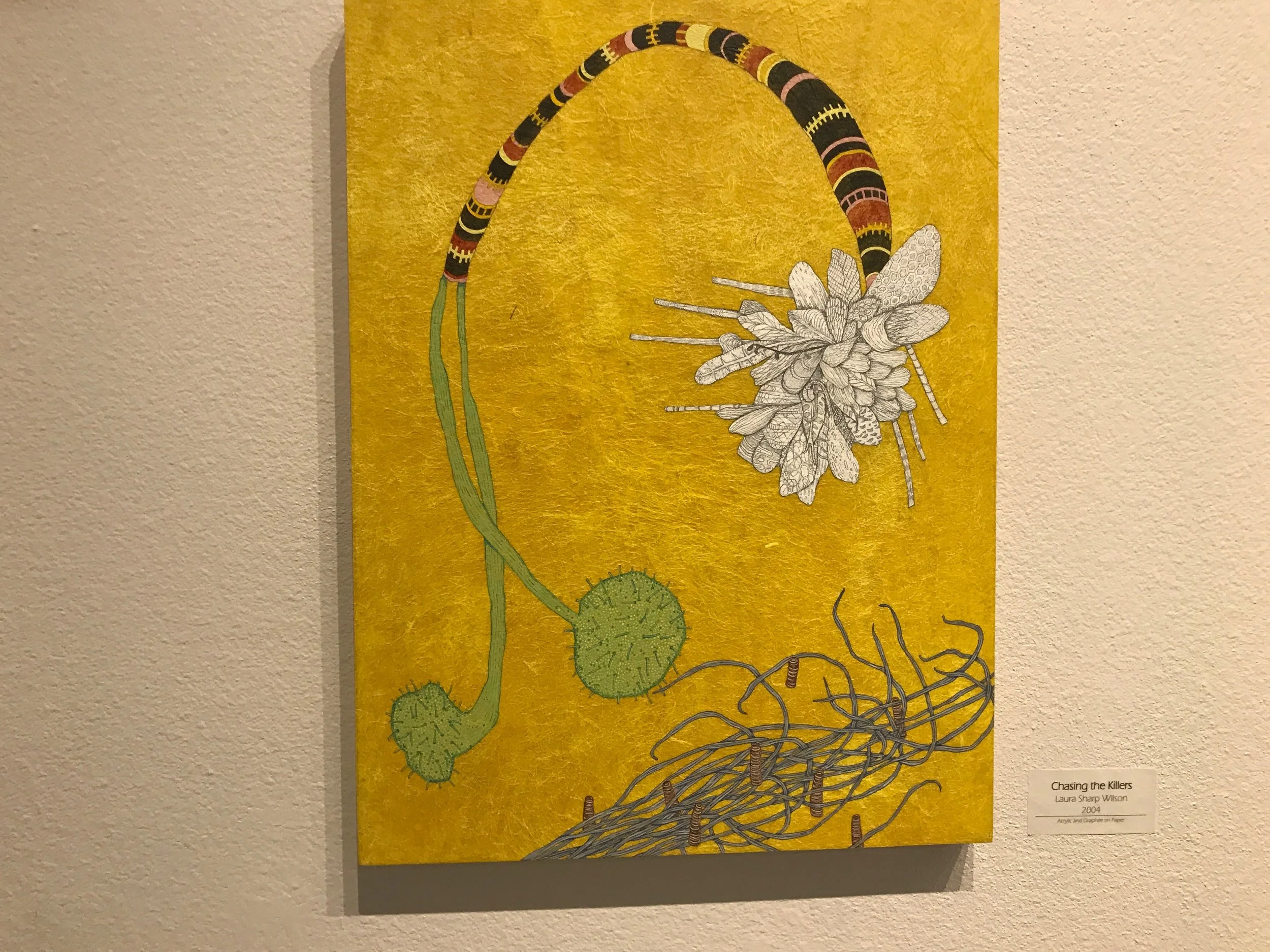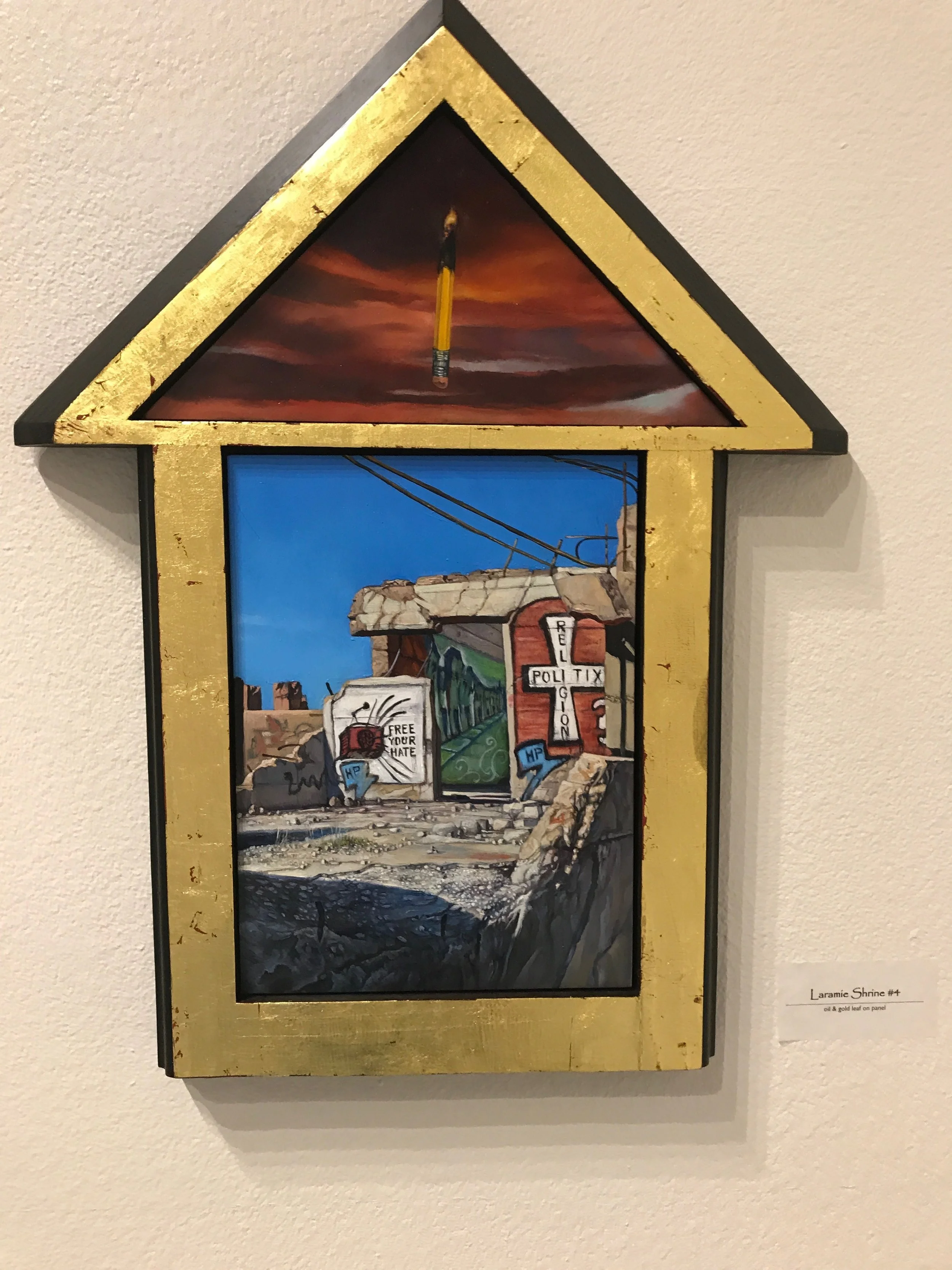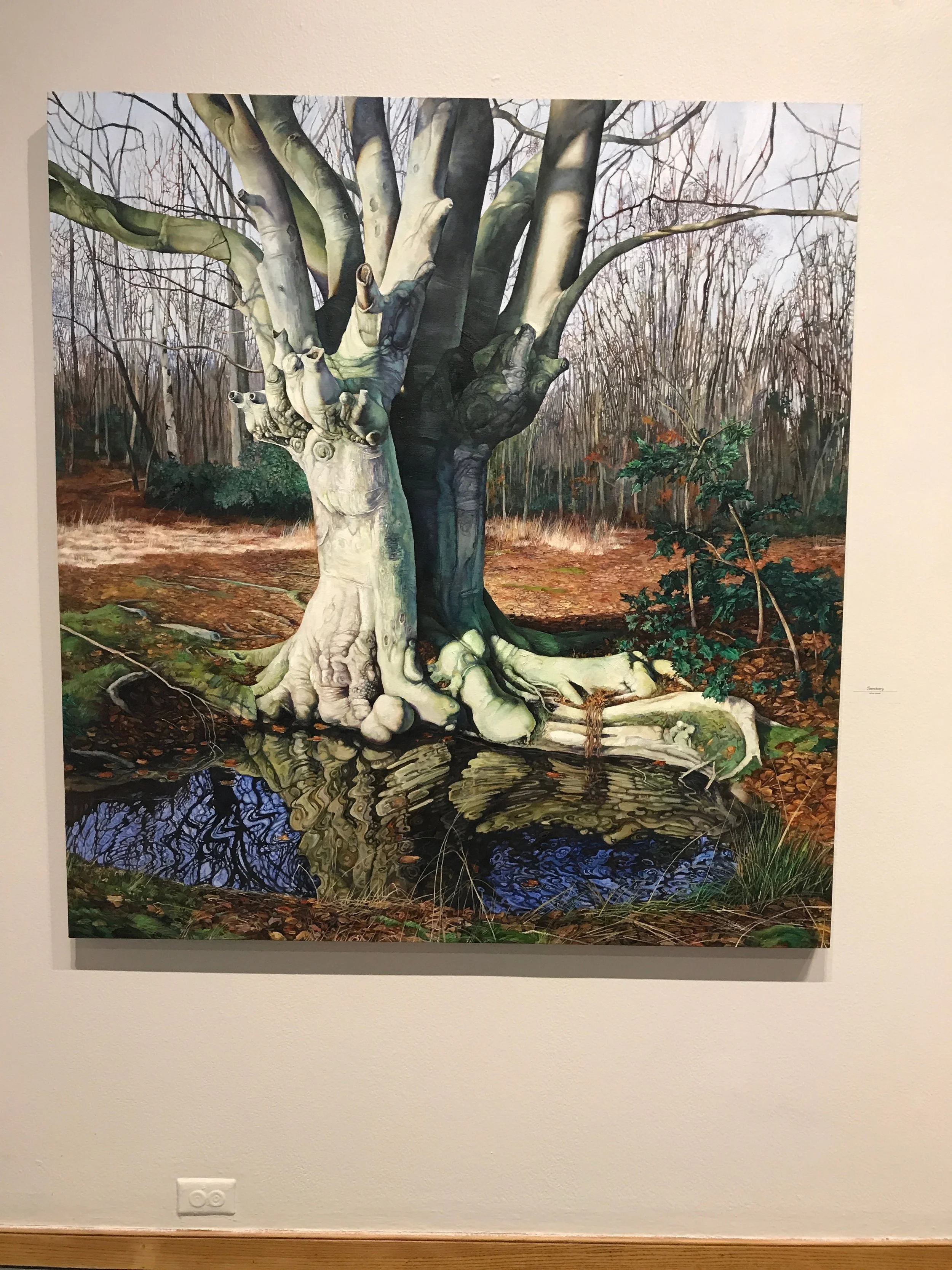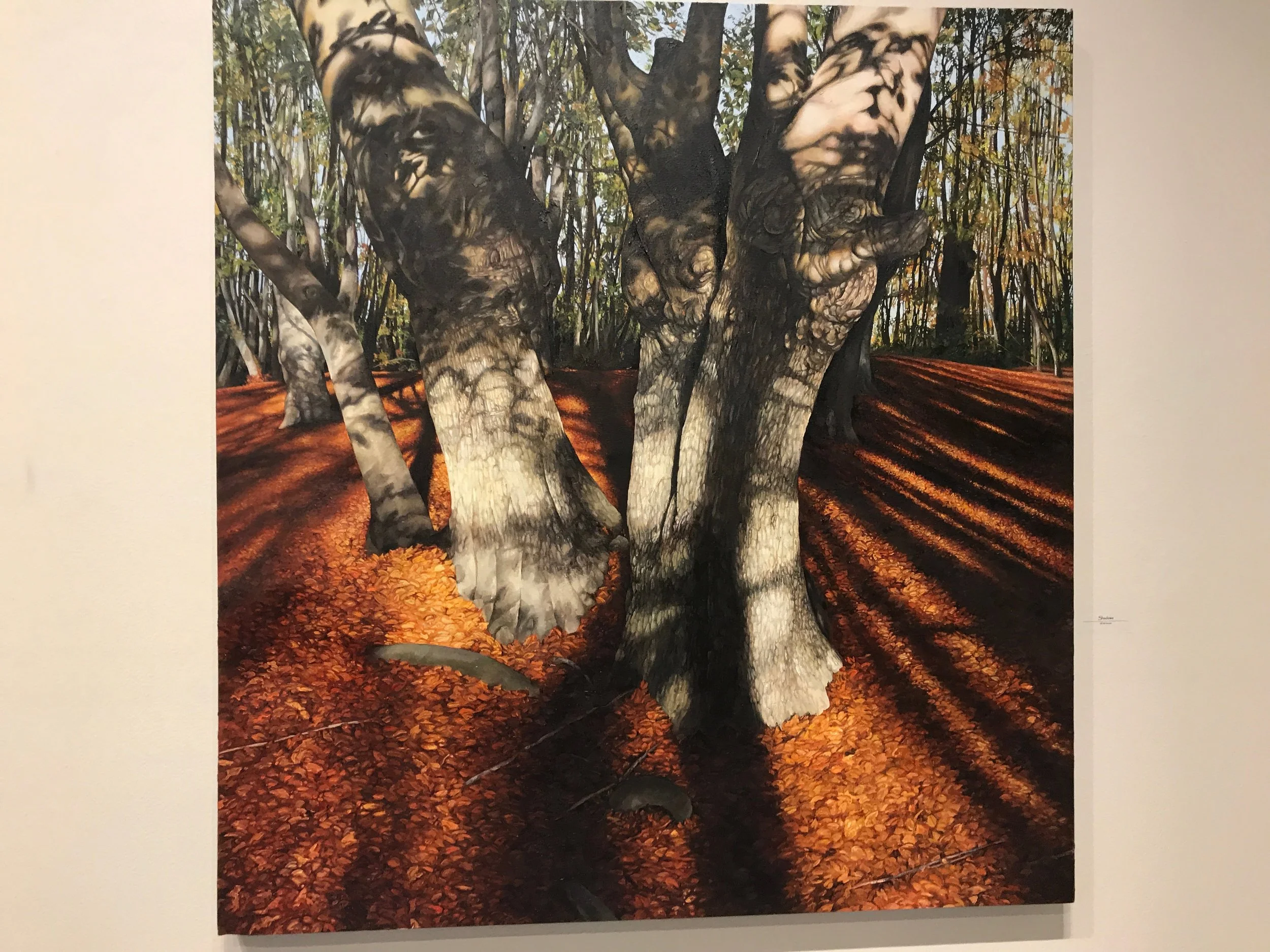 Probably my favorite of the special exhibits was a series called Trees by Ricki Klages. The series comprised of a combination of large color-saturated landscapes of forests and smaller pieces framed in little goldleaf houses with one mage containing the namesake trees and another seemingly unrelated image. The larger pieces showcase her virtuosic ability to capture hyperrealist scenery that feel like they’re leaping off the canvas, and the houses have a beautifully surreal quality to them that showcases the variety of styles she can work in while also forcing your brain to work a little to try to grasp the dream logic linking the two images. I’m not sure it’s always possible to make that connection, but I think the sensory experience of engaging with the piece is wholly worthwhile nonetheless.