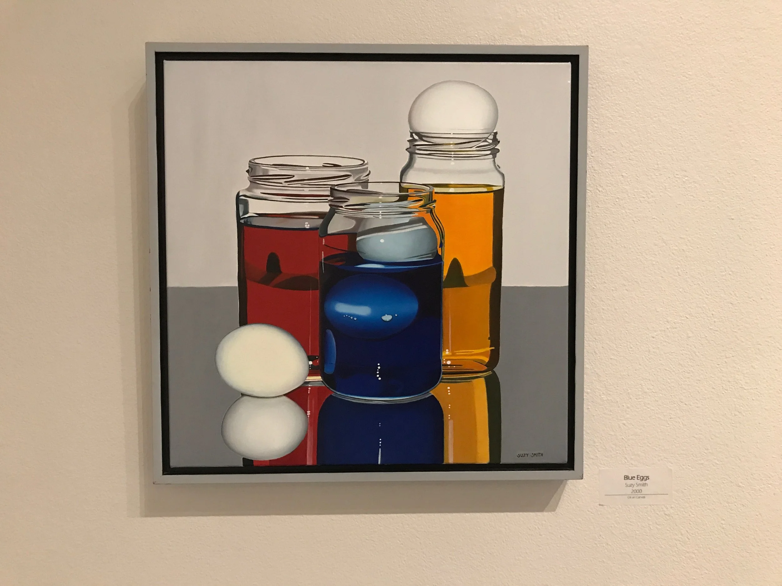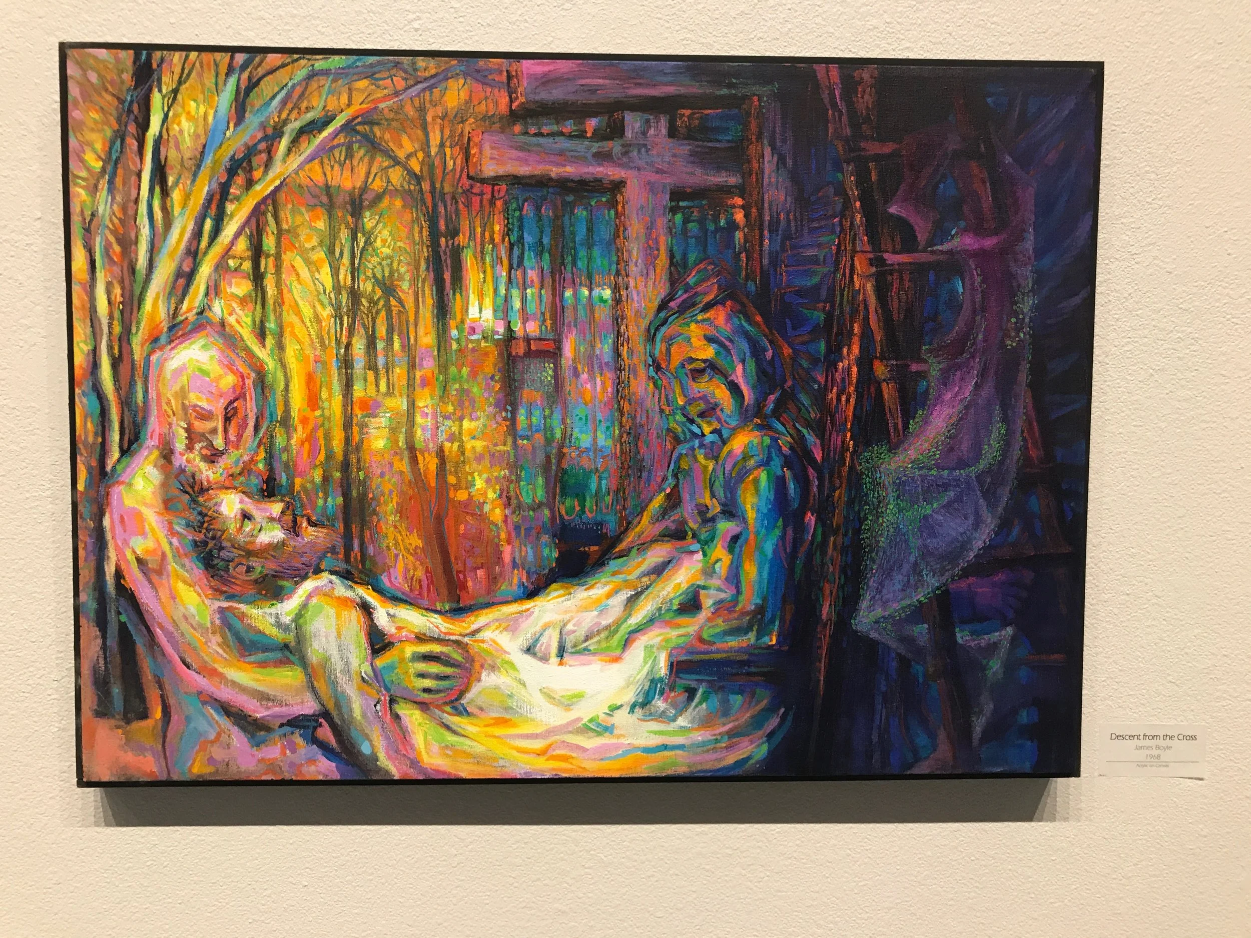 My favorites of these prismatic paintings were: Rupert Conrad’s soft and hazy Memories of Mexico which capture a gauzy childlike nostalgia; Conrad’s ominously beautiful Drying Sails that makes brighr light colors more menacing than I’ve ever seen before; James Boyle’s dream-like dizzying Descent from the Cross which uses its colors blend a more abstract sense of life and death into a familiar image; and Suzy Smith’s simple yet surreal still life humorously called Blue Eggs which does deceptively incredible things with reflections.