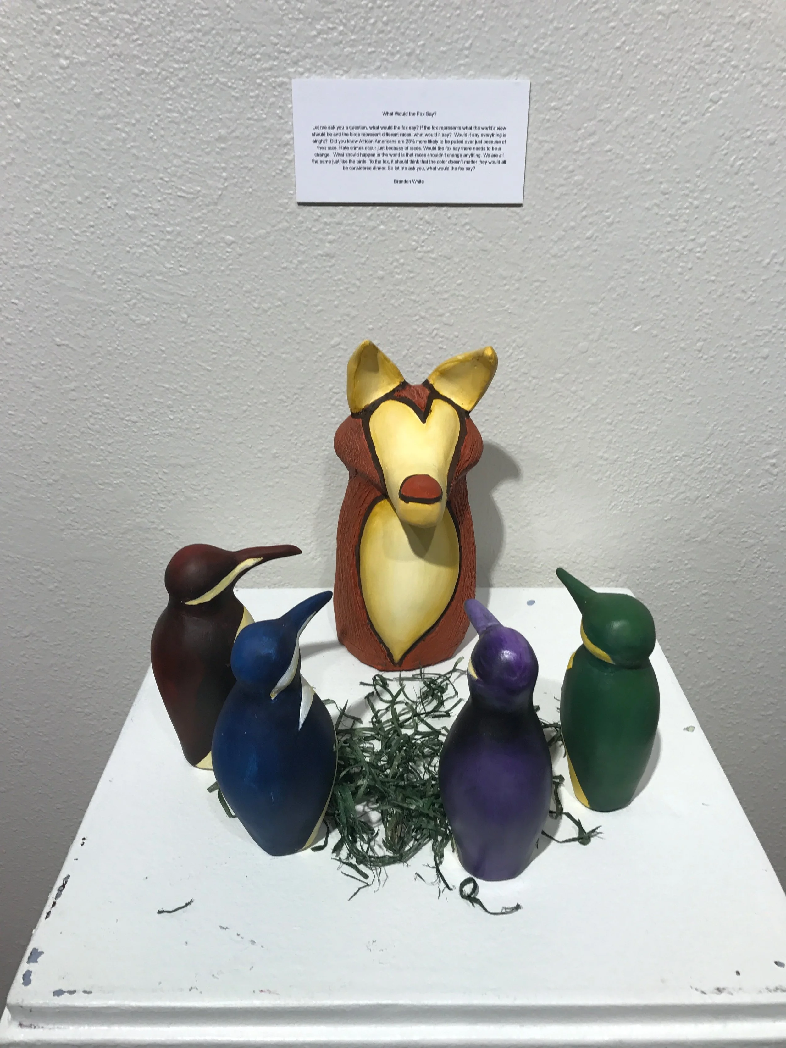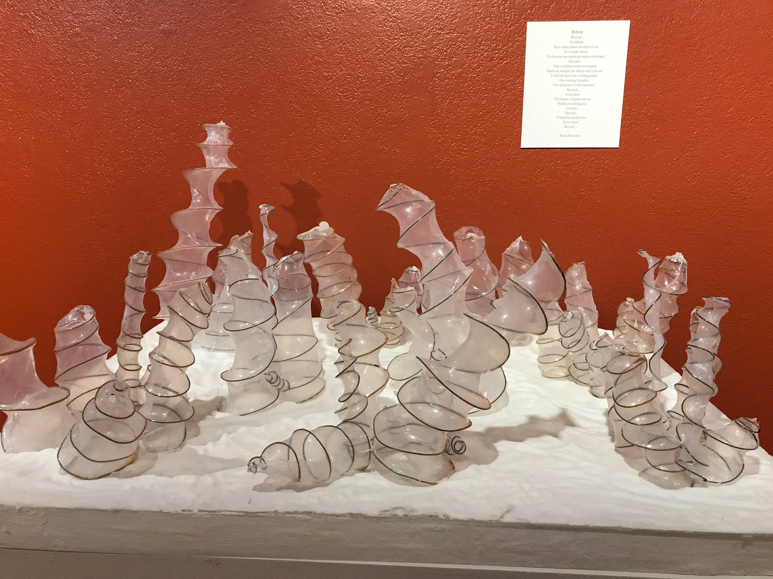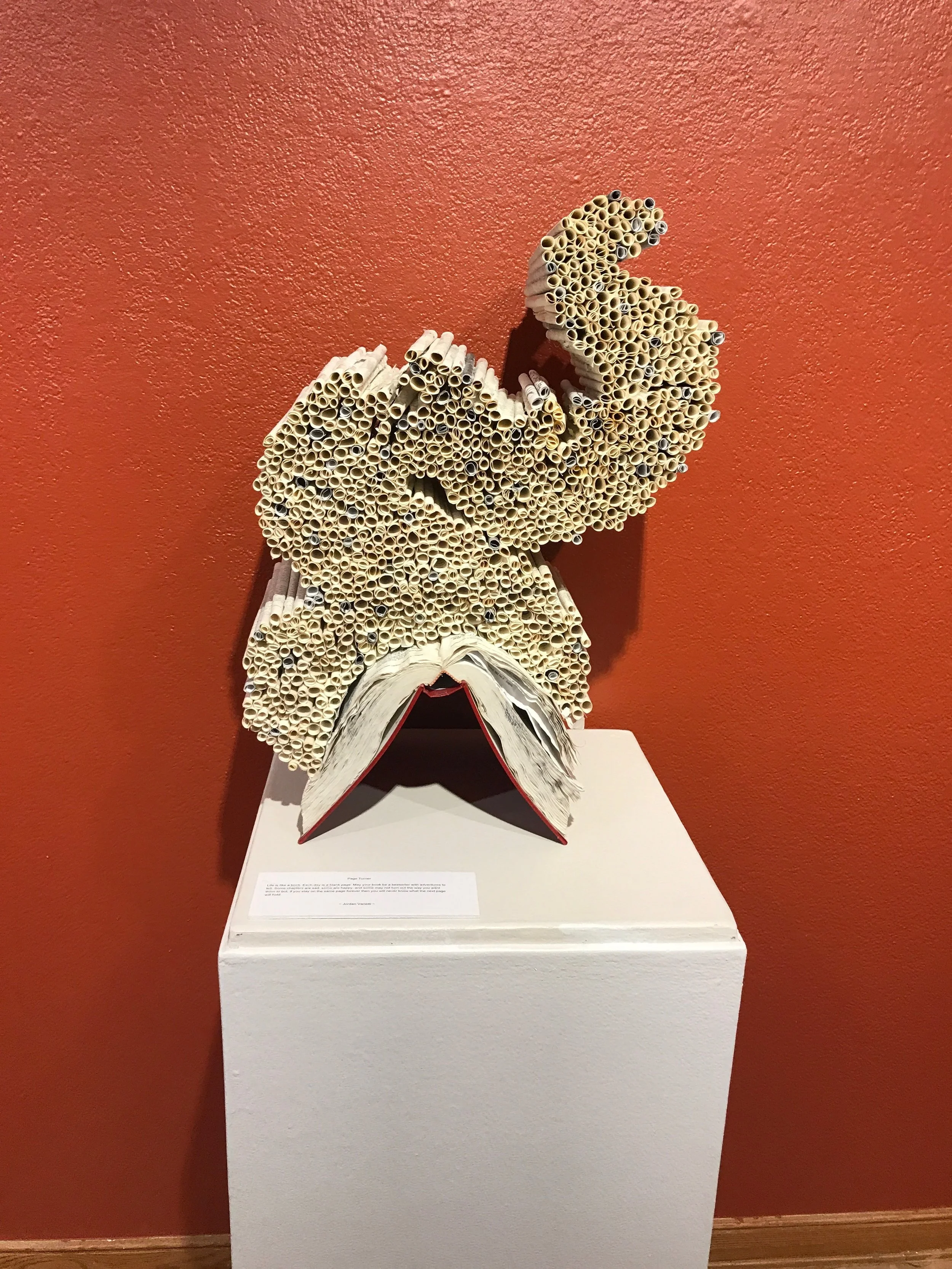 In the hallway back to the main lobby, there was a series of sculptural pieces inspired by literature and poetry. My favorite included: abstract, sweetly lyrical representations of billowing winds by Rossi Brownwell; a cute mythological scene made from amazingly colored ceramics of a fox holding court for the birds of the forest by Brandon White; and a lovely tribute to the magic of reading a good book in the form of a sculpture made of a magical swirl of pages by Jordan Vanetti.